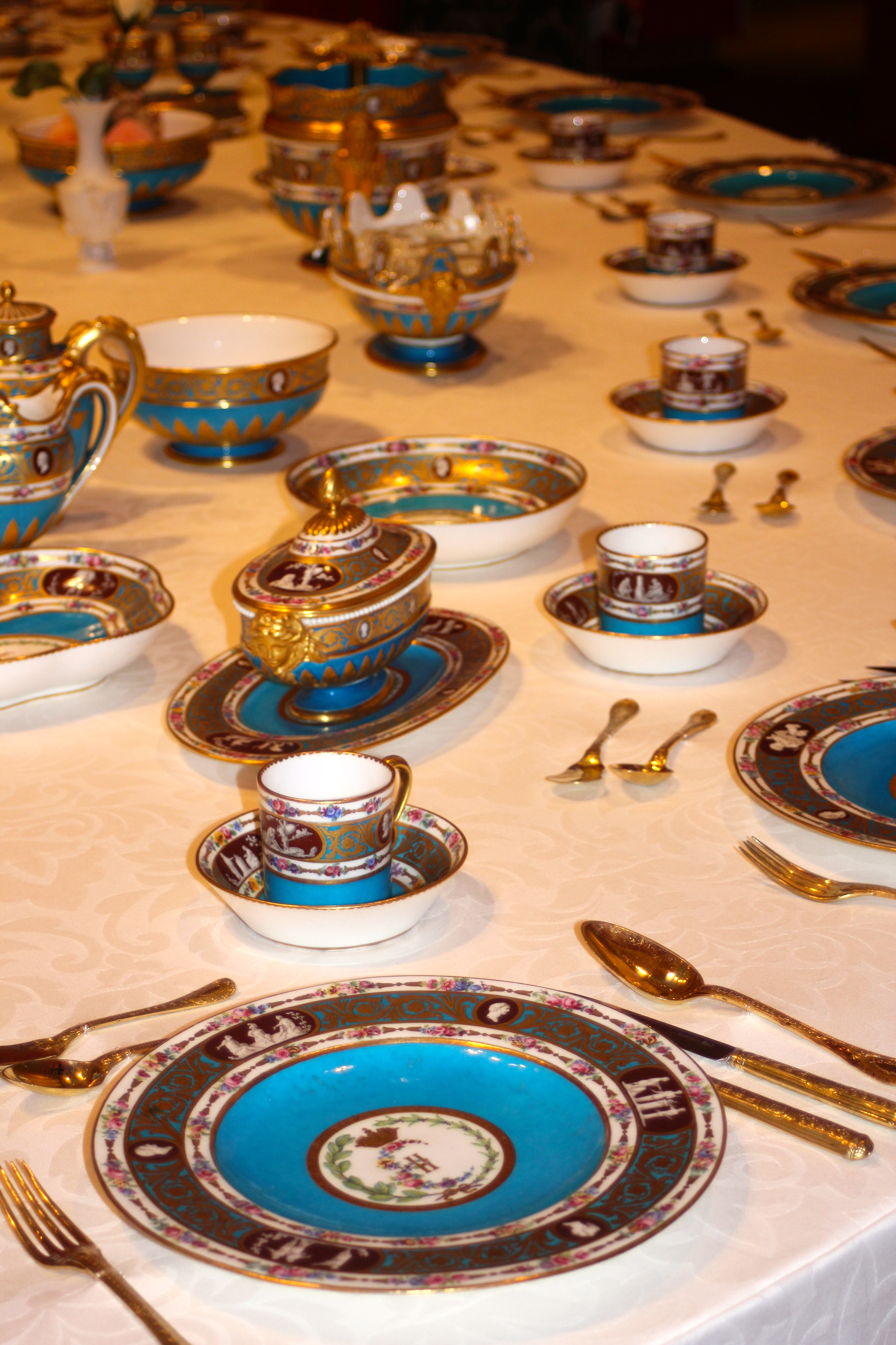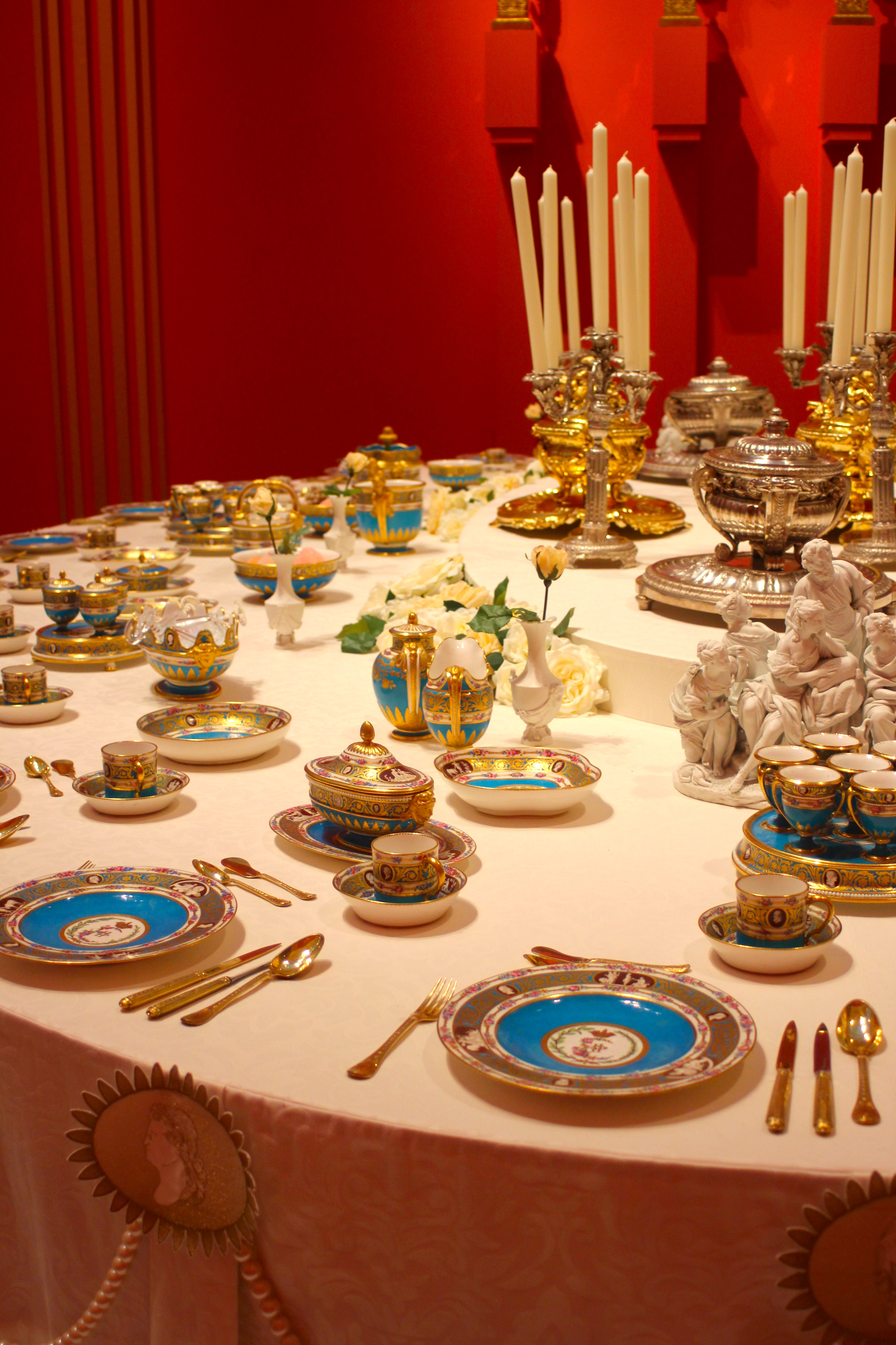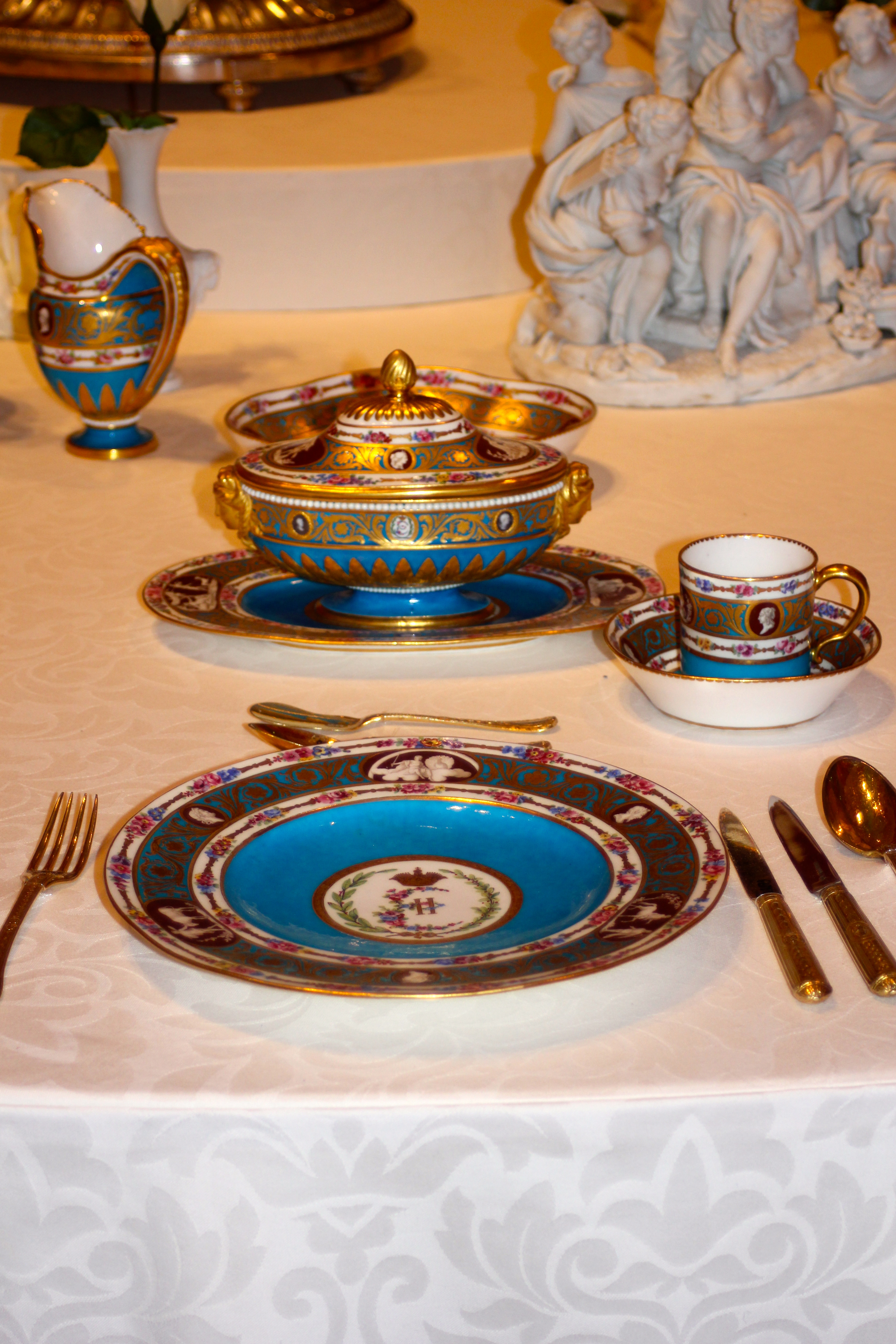 Het entree van de tentoonstelling is overweldigend, je ziet mooi gedekte tafels in een bijzondere omgeving. De bezoeker wordt eerst langs allerlei weetjes en feiten geleid rondom het dineren. Zo wordt beschreven wat de kledij was tijdens zo’n banket, de etiquette, wat werd er gegeten, wie zat naast wie, wat waren de accessoires en hoe werd de tafel gedekt. Hierna belandt je in een prachtig verlichte en sfeervolle ruimte waar de meeste serviezen tentoongesteld staan. Ook dus dat mooie servies uit Sèvres. Een servies dat meteen opvalt door de lichtblauwe cyaan kleur.