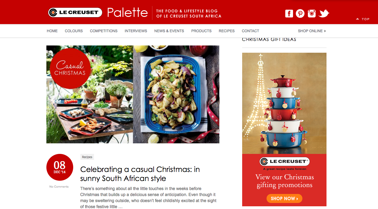 Waar ik vooral helemaal fan van ben, is het blog wat Le Creuset South Africa heeft. http://www.lecreuset.co.za/blog/ Daarop staan alle nieuwtjes op, de leuke events die zij organiseren, kookwedstrijden en interviews met Le Creuset gebruikers en personeel. Te leuk en heel erg inspirerend. Met name de events die zij organiseren met onder andere bekende koks, maar ook gewoon met consumenten zijn erg leuk.