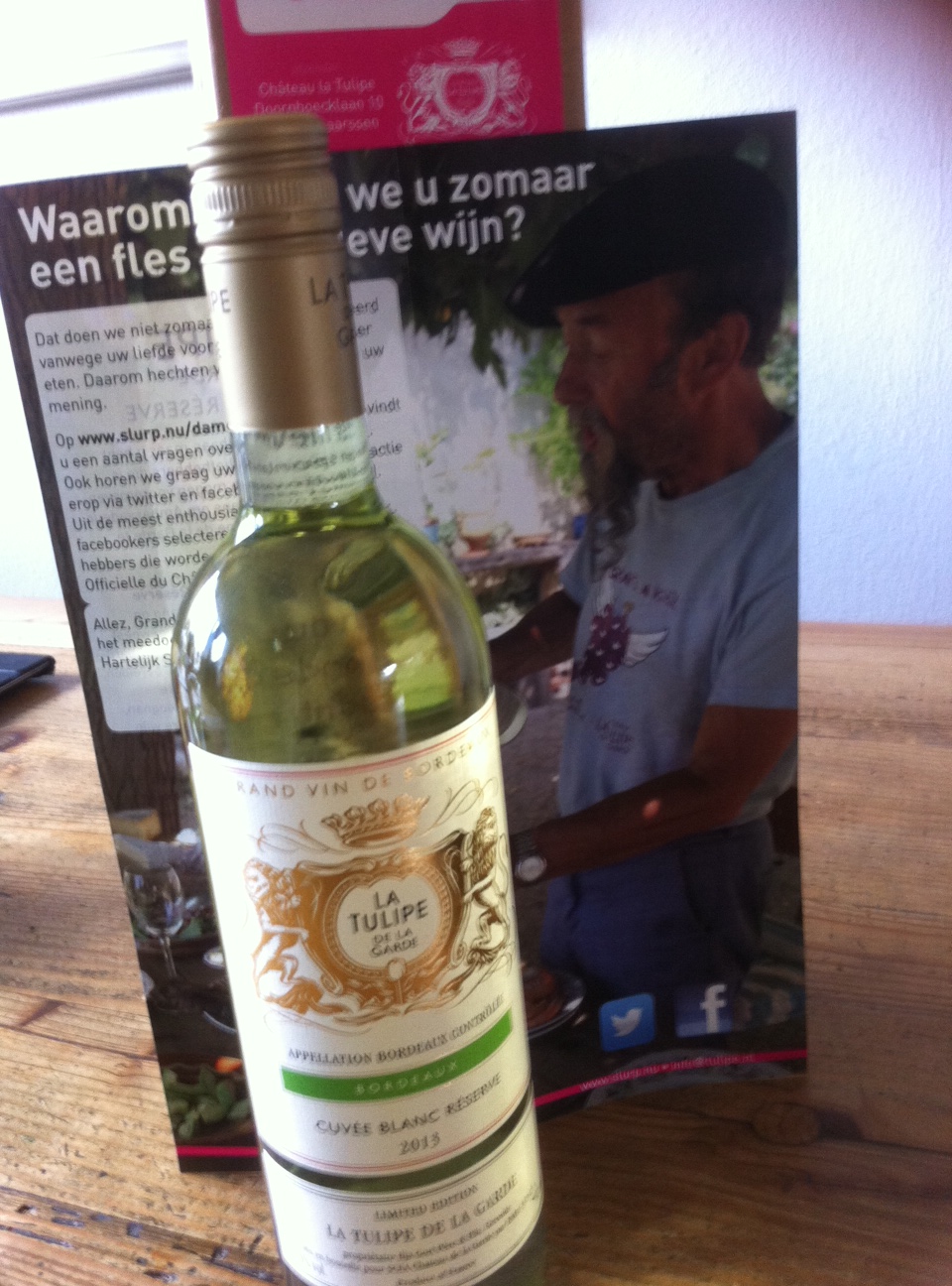 In de loop van de week ontving ik een fles witte wijn van La Tulipe de La Garde van Ilja Gort. Ik was één van de 100 bevoorrechte personen die deze, toen nog niet in de winkel te koop zijnde, witte wijn mocht gaan proeven. Na het proeven vulde je een enquête in en kon je kans maken om ambassadeur officiële du Chateau La Tulipe de La garde te worden. Denk niet dat ik het geworden ben, heb tot op heden nog niks gehoord. Maar wonderen zijn de wereld nog niet uit.