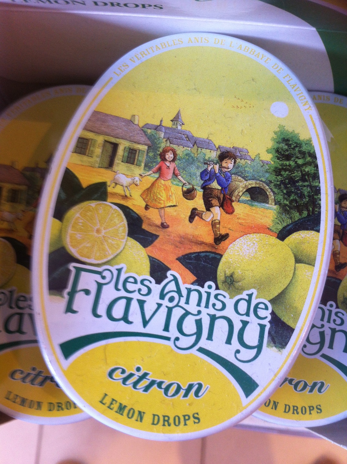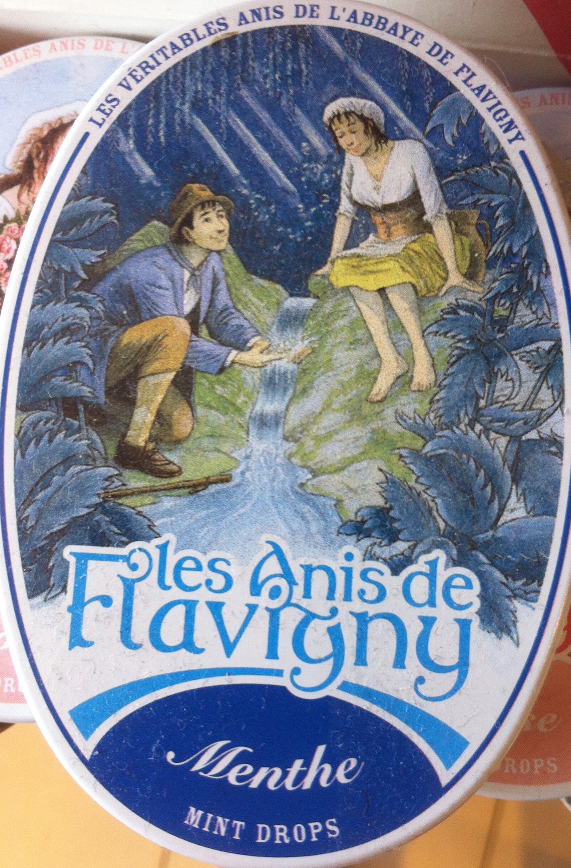 Wie kent ze niet, de ovale blikjes met een afbeelding erop van een herder en een herderinnetje. In het blikje zitten de anijssnoepjes die gemaakt worden in Flavigny in de Bourgogne streek, dit plaatsje fungeert als achtergrond op de afbeelding van het verliefde stelletje.