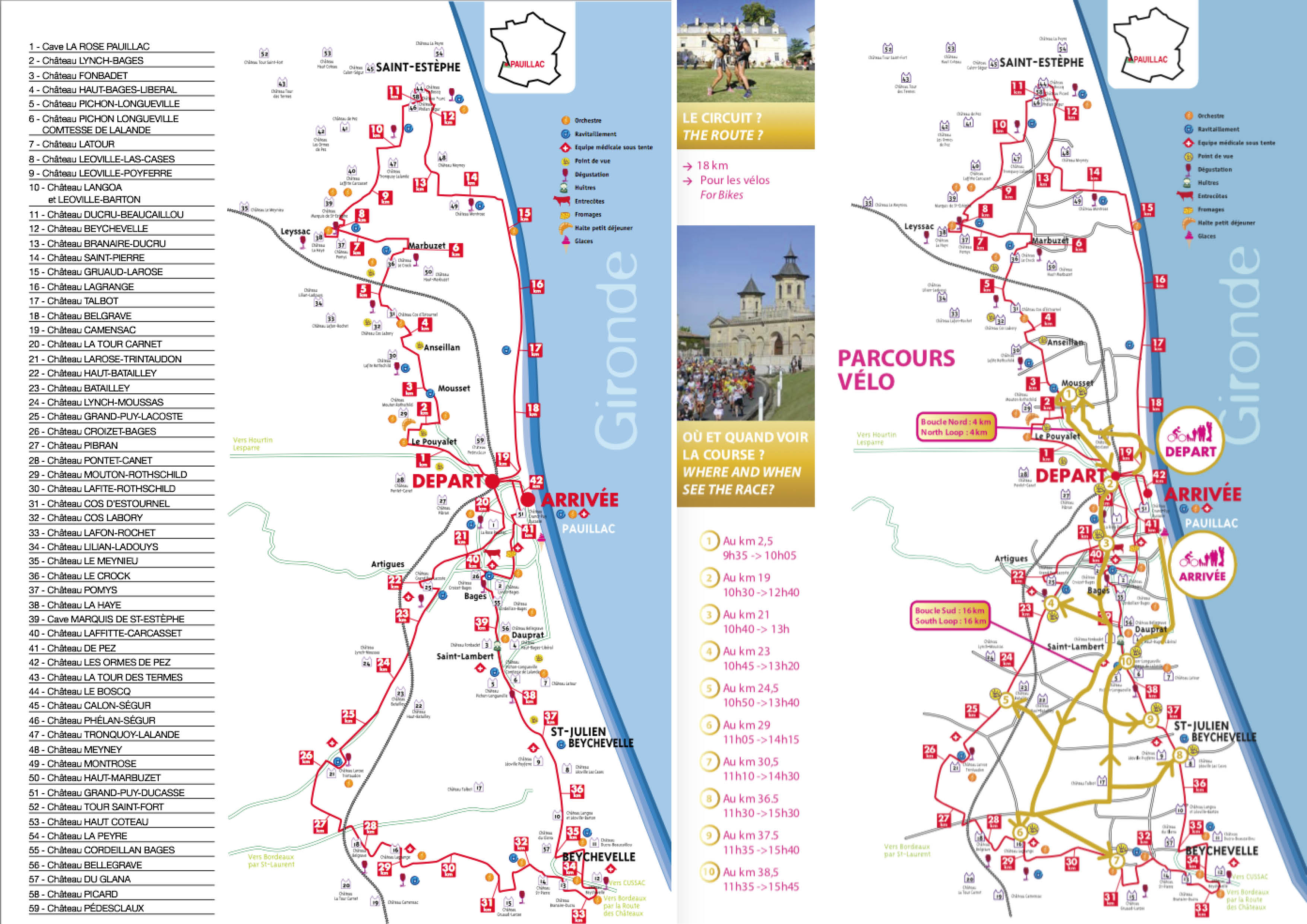 Daarnaast zijn de tussenstops van de marathon op de meest mooie en grote kastelen van de streek. Zo kom je langs Chateau Pichon Longueville, Chateau La Tour Carnet, Chateau Mouton-Rothschild en Chateau Lynch-Bages. Niet de eerste de beste chateaux waar je, als het mee zit, ook nog een lekker slokje wijn aangeboden krijgt.