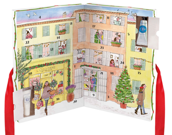 Er komen natuurlijk ook een aantal van die adventskalenders van Franse bodem. Deze adventskalender van L’Occitane is mooi, leuk en er zitten fantastisch heerlijke producten in. Hij ziet er waanzinnig uit met de illustraties van Kanako, de bekende illustratrice van My Little Paris. Iedere dag kan je een luikje open maken en 1 van de 24 verrassingen ontdekken. Wat lijkt mij dat spannend!!! Er zitten 17 producten in zoals creams, shower gels en een shampoo en 7 goodies zoals stickers en nagelvijltjes.