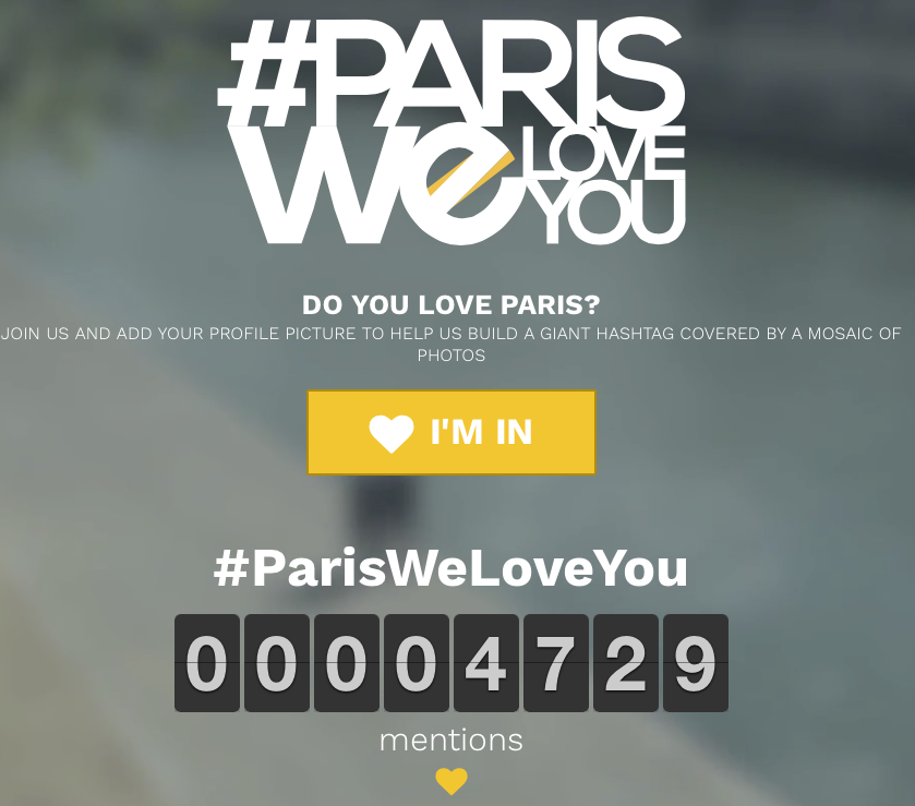 Fans, liefhebbers en bewoners van Parijs worden uitgenodigd naar de site parisweloveyou.fr te gaan en daar een foto te uploaden die hun liefde voor de stad toont. Deze foto’s worden niet alleen op de site getoond, maar over een aantal weken ook gebruikt ‘in het echt’: op een symbolische plaats in Parijs wordt dan een levensgrote hashstag #ParisWeLoveYou onthuld. Denk onder andere bij de Eiffeltoren, La Defense of Notre Dame. Kom dus in actie om de wereld te laten zien dat het leven in deze prachtige, mooie en krachtige stad gewoon doorgaat.