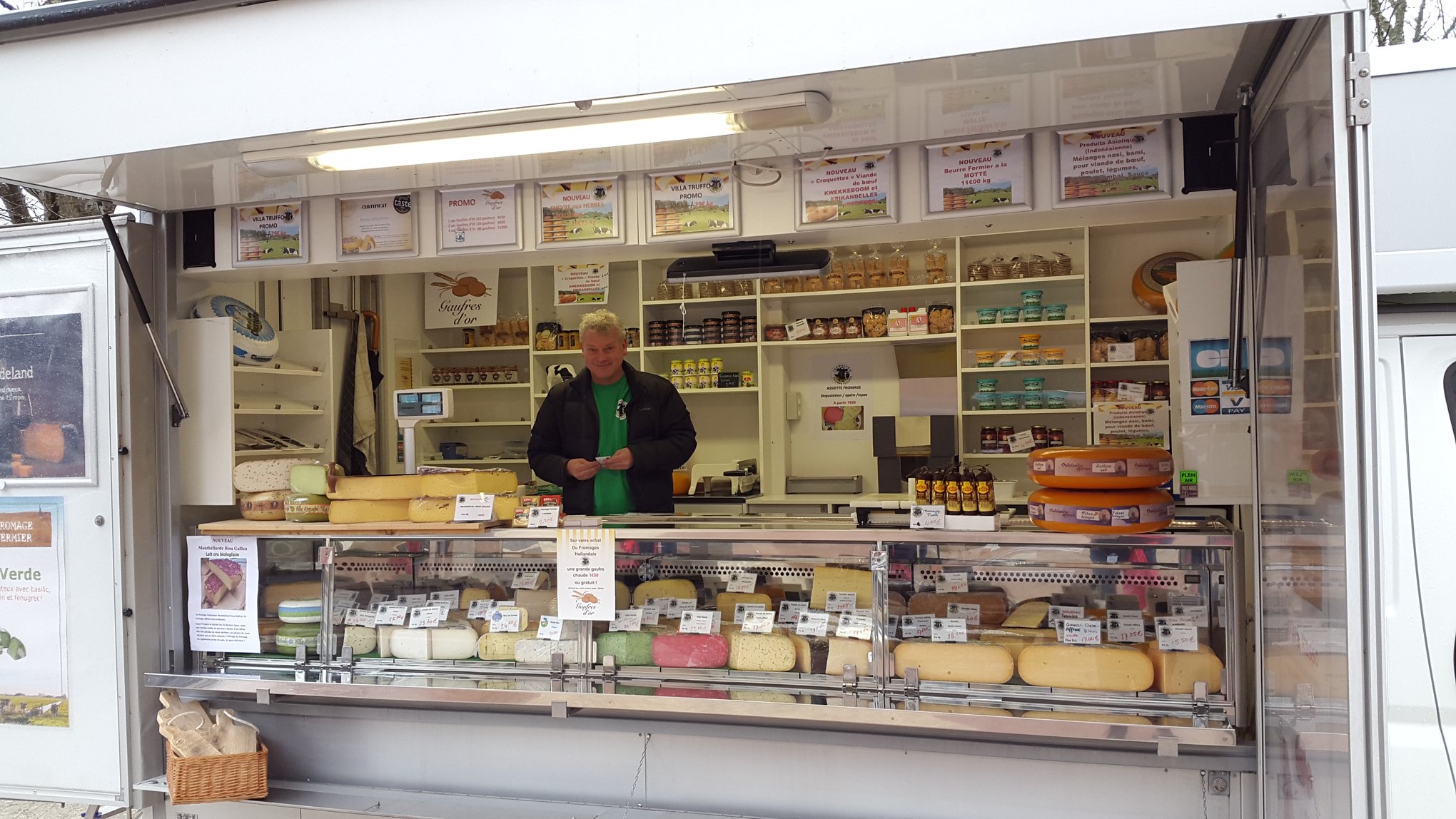 Op een dag zagen we op internet een drukkerij te koop staan, Eric is graficus en drukker van beroep dus….kijken, nadenken, rekenen en op een dag besloten! In 2009 zijn we vertrokken. Redelijk belazerd! Helaas bleek er nog al gesjoemeld met cijfers en was de Nldse makelaar niet capabel genoeg om de mankementen in het contract naar boven te halen, en helaas ons Frans op dat moment nog niet goed genoeg om de lijken uit de kast te vissen dus na 1.5 jaar de stekker eruit getrokken en met onze laatste centen en wat hulp ons huidige bedrijf over genomen van een vriend die dit was gestart in april 2009 en wegens heimwee kinderen terug ging naar Nederland. Een kraam met Hollandse kaas op de markt! Voor ons een kans die we niet wilden laten liggen want terug gaan naar NL was voor ons geen optie.