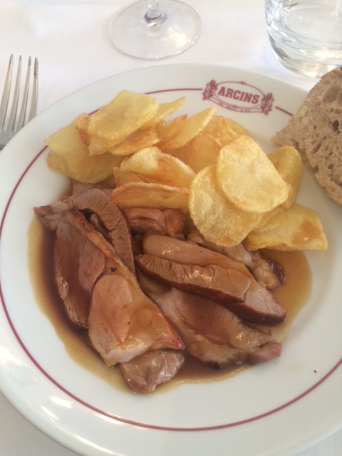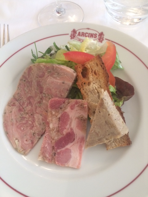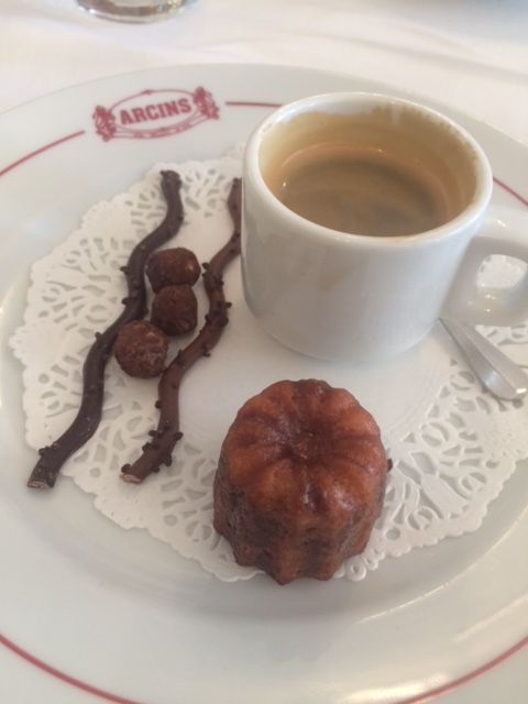 Het voorgerecht bestond dit keer uit rillettes en koud vlees. Het hoofdgerecht was schapen vlees met huisgemaakte ‘chips’ en als na kregen we koffie met allerlei lekkernijen uit de streek zoals canelé, chocolade van Mademoiselle de Margaux en Noisetines de Medoc.