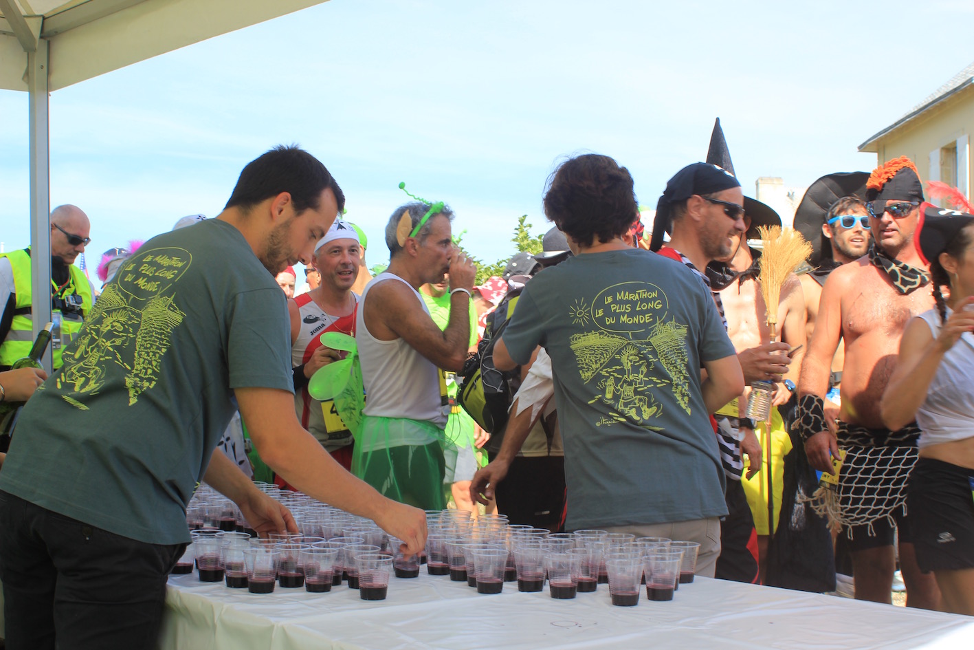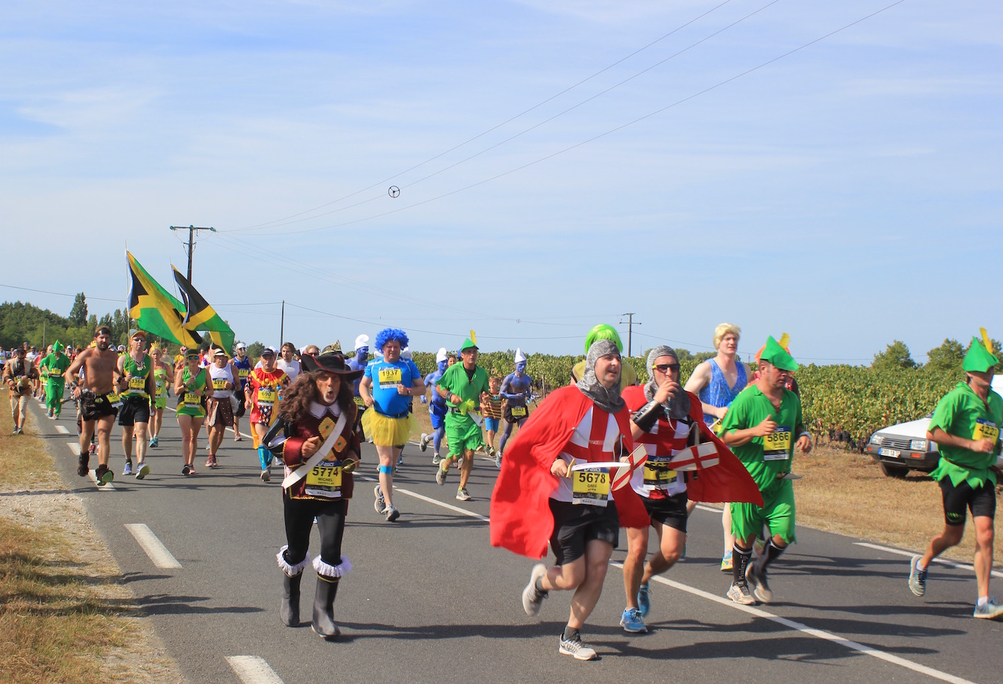 Wanneer dan eindelijk het startsignaal op de kade van Pauillac klinkt en de meute door het dorp richting de wijngaarden rent is ‘de beer los’ en kan het genieten en de pret voor de marathonlopers beginnen. Want dat staat naast de prestatie voorop, vooral genieten en veel plezier beleven aan dit mooie renfestijn!