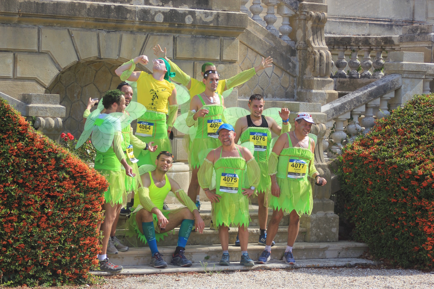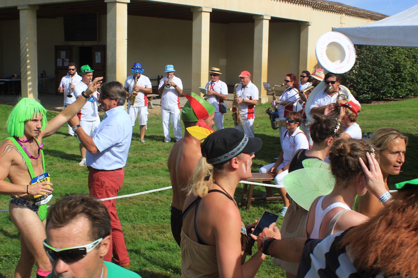 Allemaal zijn ze even vrolijk en met veel goede moed om deze marathon tot een goed einde te brengen. Aan de sfeer rondom dit fenomeen ligt het niet, die is overweldigend. Het publiek is bemoedigend en de muziekbandjes op de vele châteaux zijn opzwepend. Je blijft rennen.