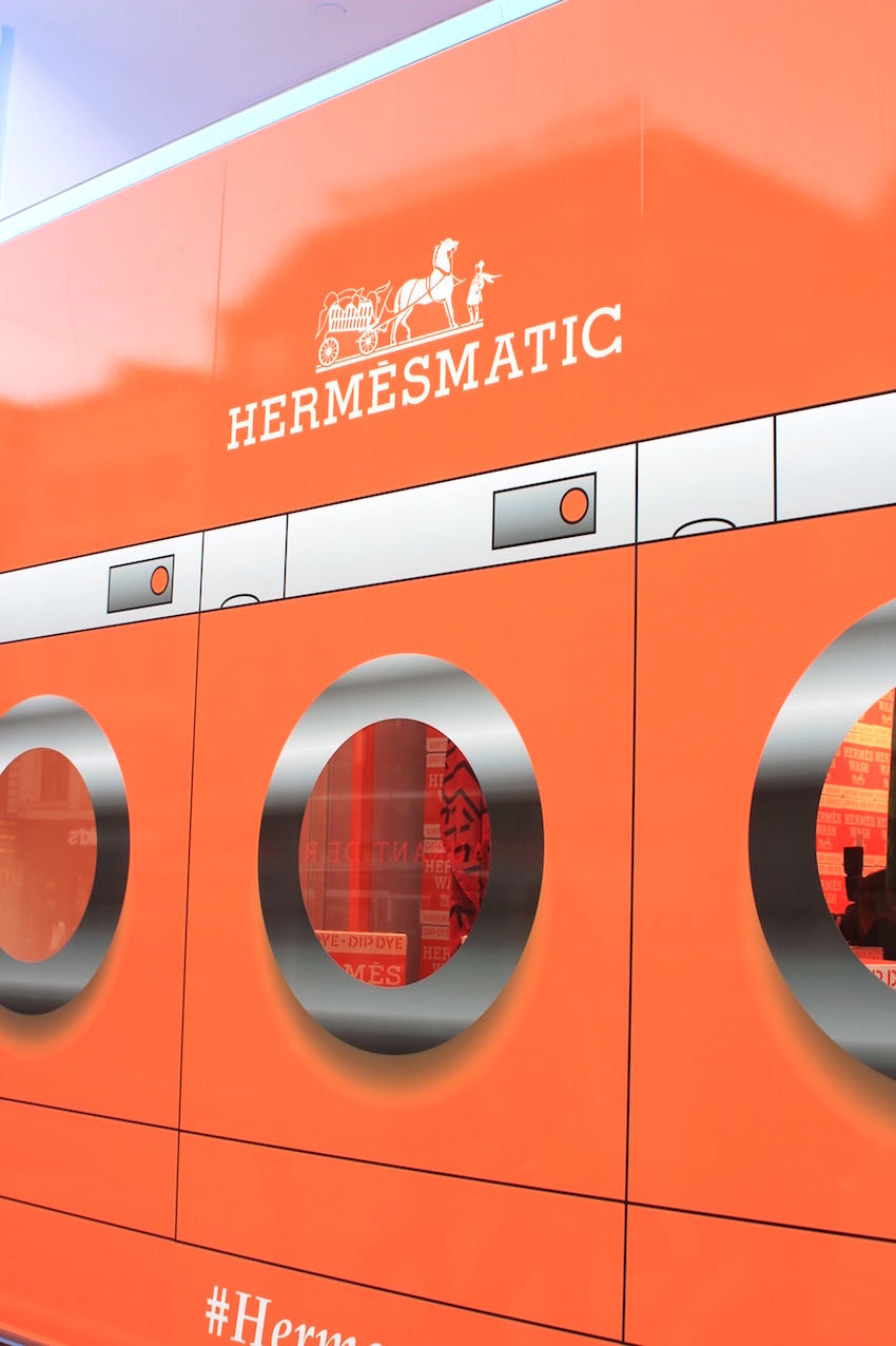 Dit alles in het decor van oranje gekleurde wasmachines en mooie balies waar de nieuwigheden van Hermès te pronken liggen.