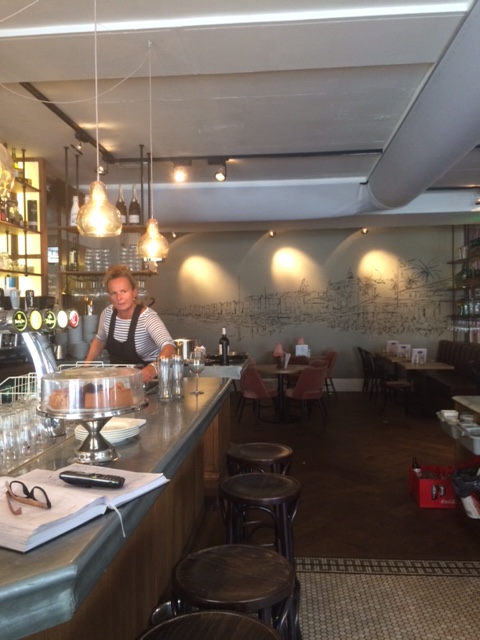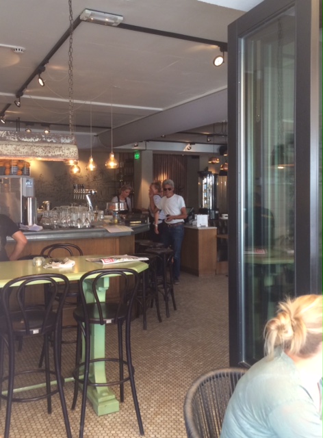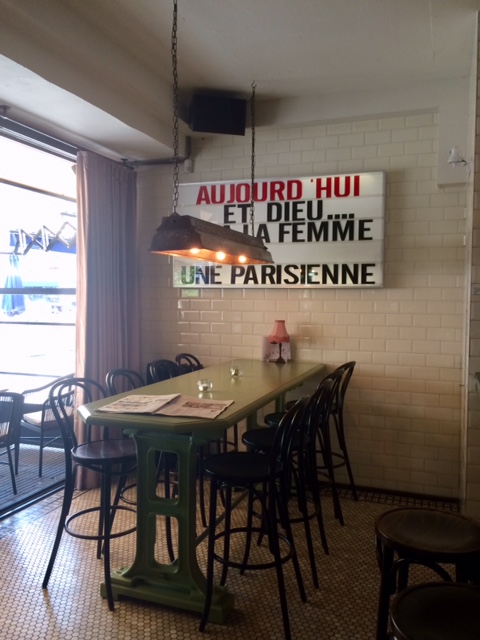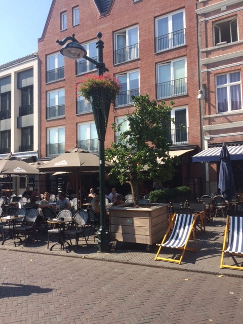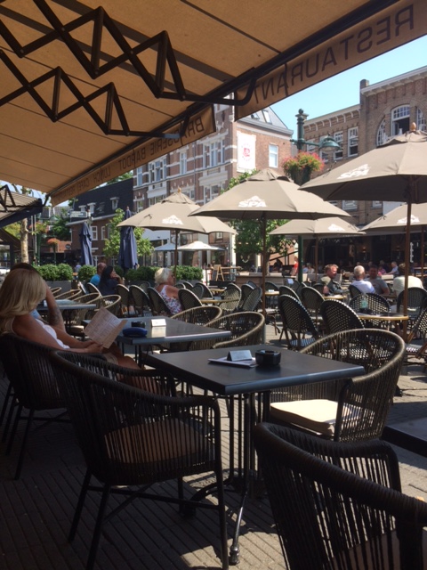 Het was erg warm die dag toen wij daar aankwamen en eigenlijk wilde we binnen zitten, maar helaas was er geen airco, dus het was binnen net zo warm als buiten. We kozen een plekje op het terras onder de luifel, wel warm, maar met een koud drankje goed te doen. Het terras oogt Frans, eigenlijk meer Parijs-achtig. Het is groot en er staan de bekende Franse gevlochten stoeltjes.