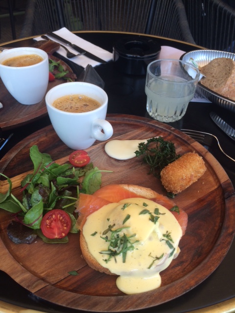 We bestelden het vistrio bestaande uit een bisque, garnalencroquette, brioche met gerookte zalm en gepocheerd eitje en hollandaise saus. Als decoratie zat er nog wat gefrituurde peterselie bij en een beetje sla. Erg lekker allemaal, alleen de bosui in de bisque hadden ze achterwegen mogen laten van mij. Qua hoeveelheid vond ik het ook wat karig gezien de prijs van 14,50 euro. Maar dit zou mij er niet van weerhouden om nog eens terug te gaan, want de ambiance was top, het personeel erg vriendelijk en ze hebben een zeer aantrekkelijke (diner)kaart. De Chardonnay uit de Pays d’Oc die ik bij het vistrio dronk was trouwens mooi van kleur en goed op dronk.
