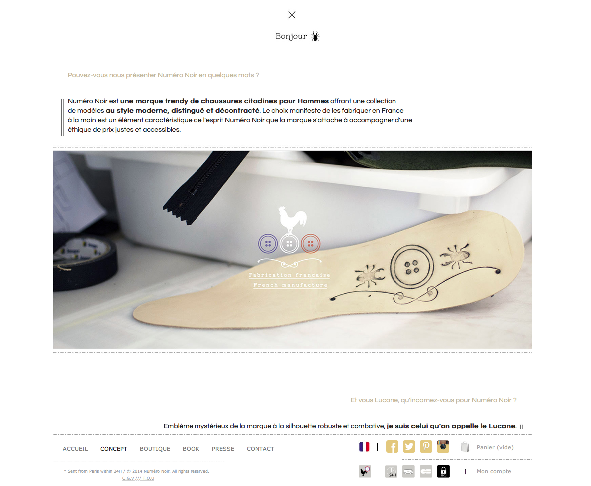 Nog een mooi voorbeeld is Numero-noir. Zij ontwerpen en produceren schoenen. Ook een prachtige site, mooie ontwerpen en op hun site staat groots dat de producten gefabriceerd worden in Frankrijk.