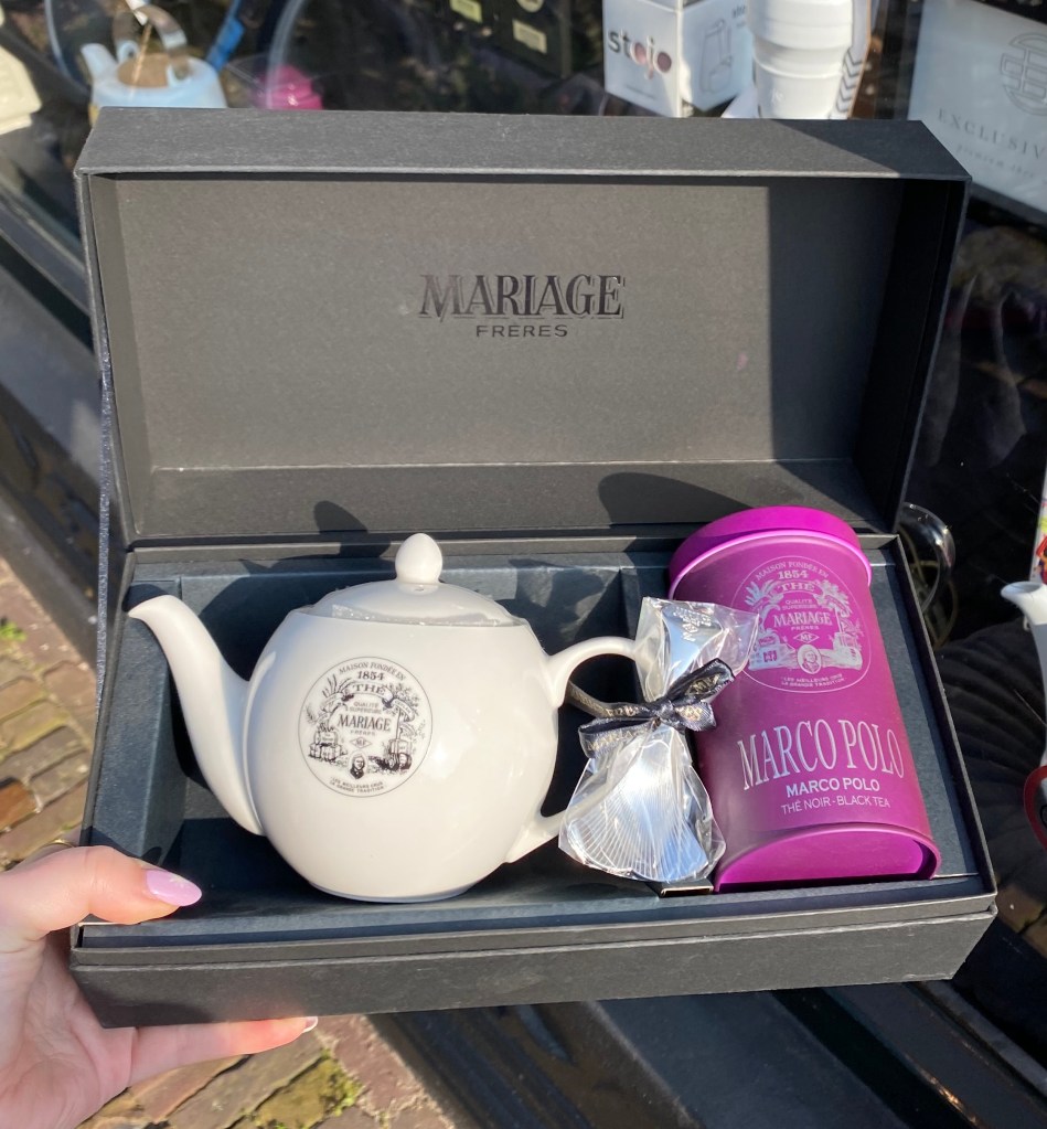 Het cadeaupakket bevat een mooie Mariage Frères porseleinen theepot, een zilveren theelepel waarmee je perfect de thee kunt afmeten en een luxe cadeaublik met Marco Polo thee.
