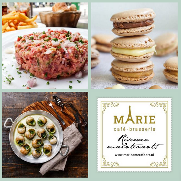 Ik ben helemaal blij, eindelijk is er weer iets Frans bij mij in de buurt en wel in Amersfoort. Sinds 2 oktober zit er namelijk op de Utrechtseweg Café Brasserie Marie. Voor insiders: naast de prachtige bloemenwinkel Quino Damen. Ik had er al eens binnen gekeken maar toen moest er nog veel gebeuren en nu is het dan eindelijk open. En de geluiden zijn postitief. Zelf ben ik nog niet geweest maar dat gaat zeker komen bijvoorbeeld voor een heerlijke lunch met een steak tartare, Bouillabaisse, uiensoep, tounedos of poulet noir. En daarna een dessert zoals mille- feuilles en dan als afsluiter een lekkere kop koffie.