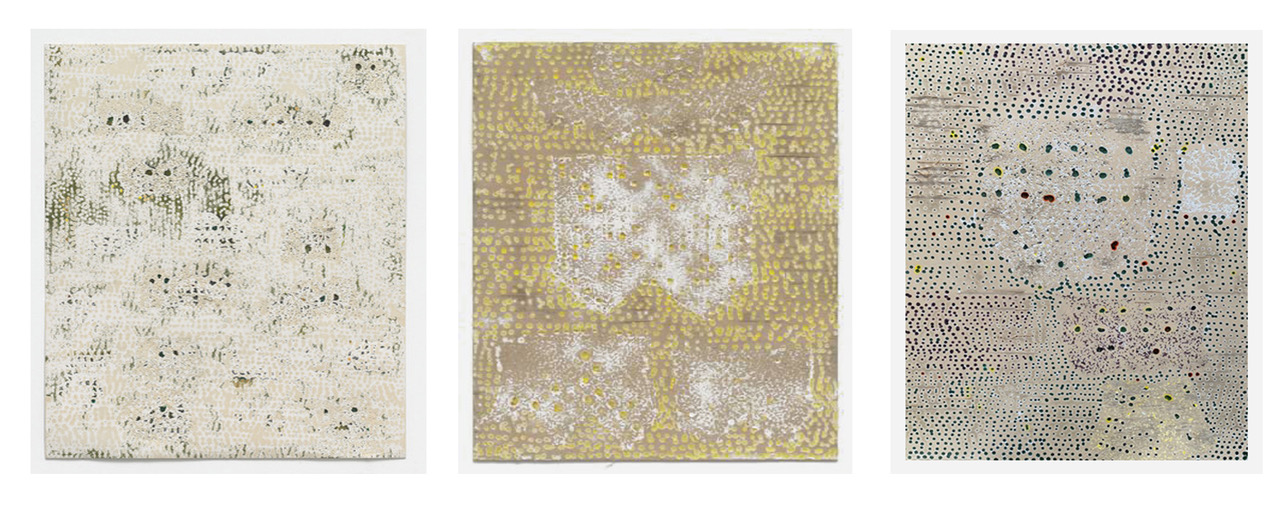 In andere werken zijn op in karton 1.60 x 1.20 m., foto’s van proeflapjes van kant zeer vergroot afgedrukt. Het karton van deze ‘Dentelles’ is verder bewerkt met inkt, pigmenten, acrylverf en hamerslag plus perforaties.
