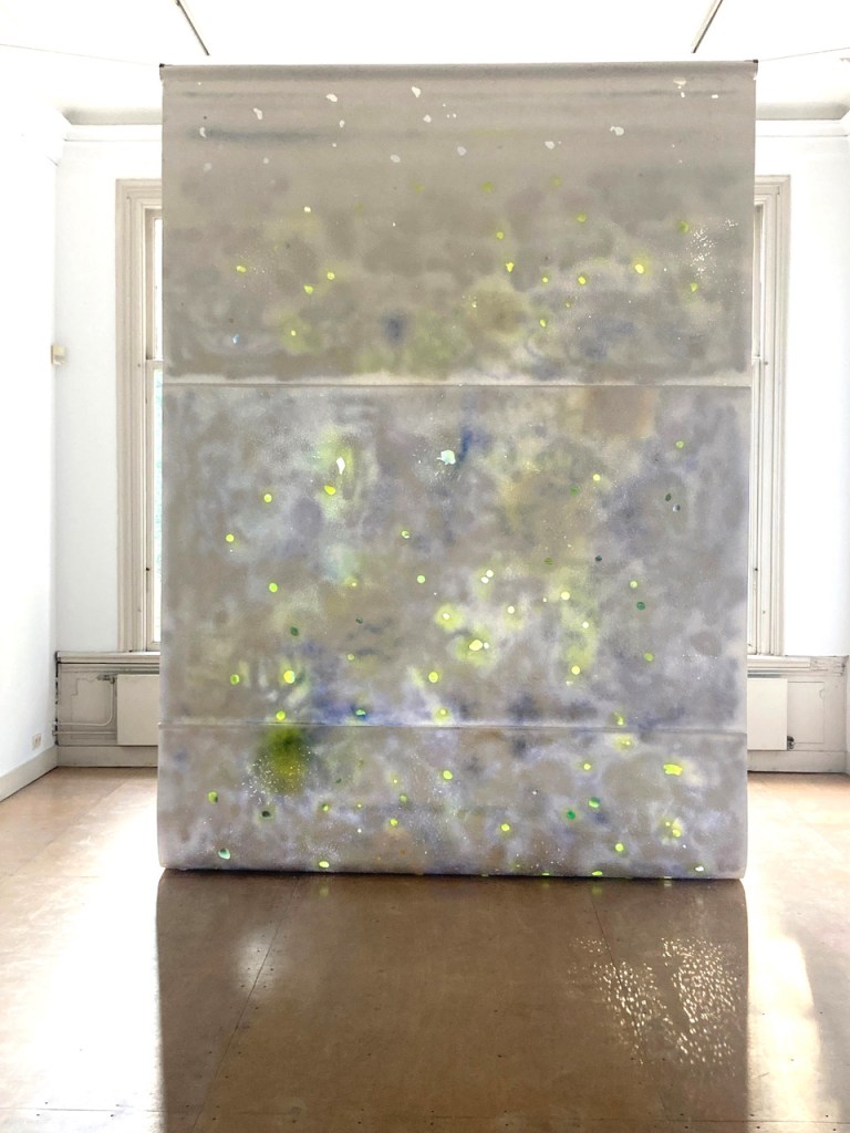 Nu tien jaar later is in PHOEBUS• Rotterdam een variatie daarop te zien, een papierwerk met een dag- en een nachtzijde, in de kleuren wit/geel/blauw/groen en in donkerder blauw/geel. Het werk kan als gordijn of kamerscherm dienen. Het papier is geperforeerd, gepigmenteerd, met de spuitbus bewerkt en van paraffine vlekjes voorzien. Deze laatste lichten op, wanneer het werk voor een raam is geplaatst.