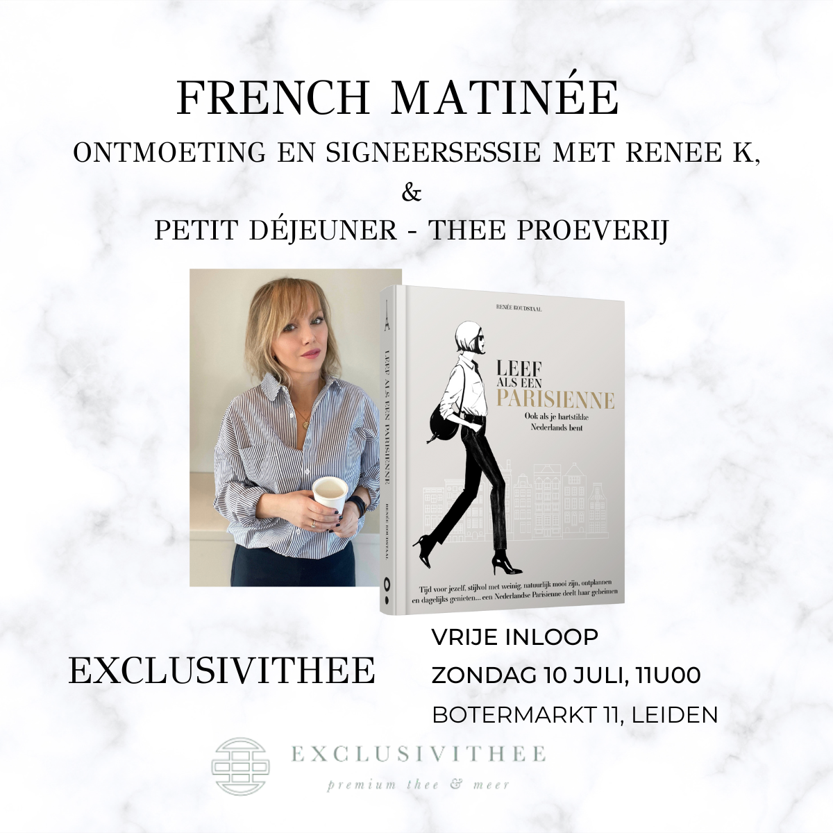 Wil je de ontmoeting en signeer sessie met Renée Koudstaal & de thee proeverij niet missen kom dan naar Exclusivithee aan de Botermarkt 11 in Leiden op zondag 10 juni. Een lekker kopje thee staat dan voor je klaar.