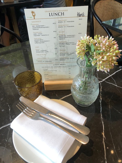 Rond 13.00 uur stappen we naar binnen bij Marie in Utrecht en wat meteen opvalt zijn de leuke lampen, beetje jaren 20/30 achtig van de vorige eeuw. Wat ook opvalt is dat het al aardig vol zit met mensen, altijd een goed teken….dan is de keuken dus goed. We bestellen een witte wijn en wat water en kijken verder op de kaart. Hé mijn favoriet, steak tartare, die nemen we dus. Ondertussen wordt het steeds drukker bij Marie. De sfeer is gezellig, zeg maar gemoedelijk, babbelende mensen, geen opdringerig personeel en het interieur is een kijkje waard, we komen de wachttijd op onze bestelling al kletsend door.