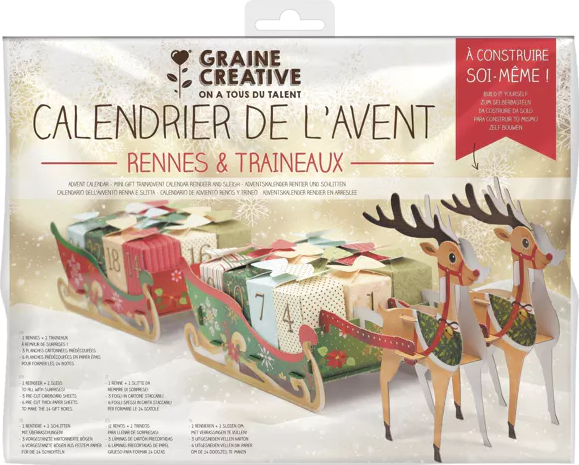 De meeste adventskalenders worden gevuld geleverd en het is dan ook een verrassing voor de ontvanger wat er achter elk luikje zit. Om een ander eens te verrassen en de adventskalender zelf te vullen heeft Les Belles Sauveurs een aantal opties zoals deze leuke rendier adventskalender. Een kalender om zelf te bouwen, bestaande uit 24 doosjes voor kleine cadeautjes, die in 2 kartonnen sleeën worden voortgetrokken door 2 rendieren. Erg origineel, eens wat anders dan de standaard dozen met vakjes en elk jaar opnieuw te vullen voor een ander of voor jezelf.
