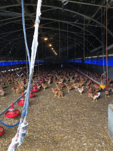 Het regent als we de oprit van kippenhouder Bernard Tauzia oprijden. We zijn vroeg opgestaan want we mogen bij het ontluiken van de luiken aanwezig zijn. Het moment dat de kippen weer los gelaten worden uit hun verblijf. ’s Nachts gaan de kippen in hun ‘cabanes’ maar overdag lopen ze vrij op gras begroeide weilanden met schaduwrijke plekken. De Label Rouge kip is dan ook een echte vrije uitloop kip. Het voedsel dat de dieren krijgen bestaat voornamelijk uit mais, dat geproduceerd wordt door de boer zelf en ook moet voldoen aan bepaalde kwaliteitseisen. Het mais wordt vervolgens verpulverd en gemengd met onder andere proteïne, soja en mineralen. Daarnaast pikken de kippen van alles op wat er op het stuk grond waar ze op leven te vinden is zoals gras, insecten, kruiden en besjes. Ze zijn continu in beweging en vinden hun beschutting in heggen of bomen op het terrein.