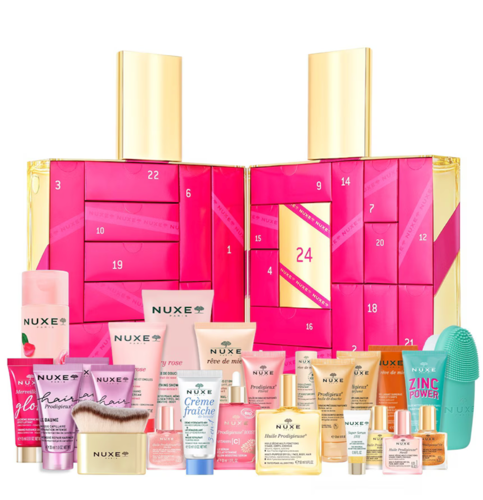 De Nuxe adventskalender is ontworpen als een gigantische fles Huile Prodigieuse met 24 schoonheidsverrassingen. Er zitten nieuwigheden in en de onmisbare Nuxe-producten voor lichaam, gezicht en Haar.