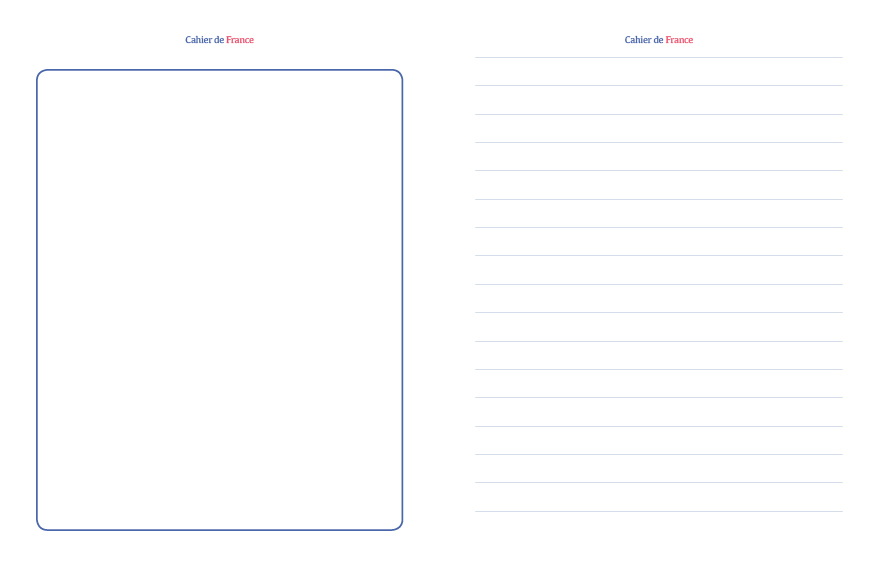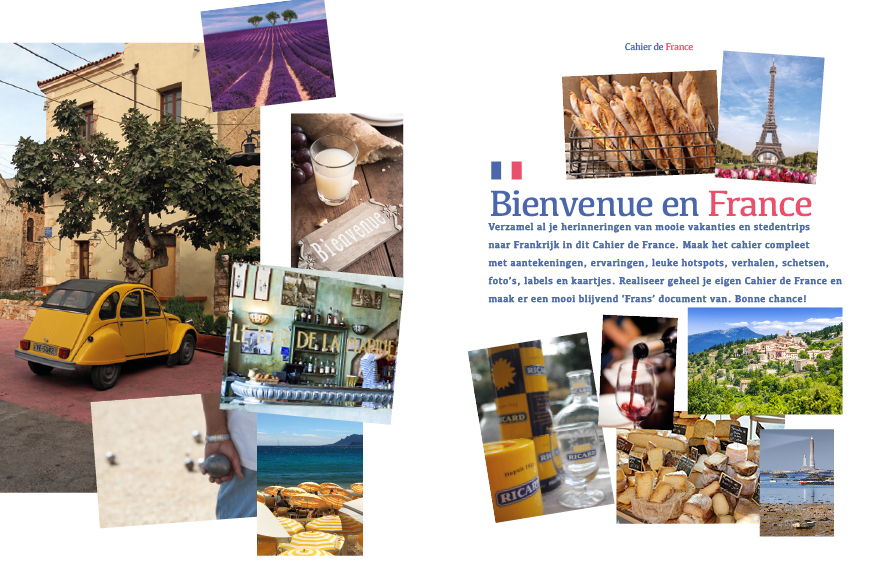 Het Cahier de France is een soort noteboekje, met een elastiek er om heen, waar je in kan schrijven, tekenen, kleuren, plakken enz. Voor een gedeelte is het boek al gevuld met plaatjes en kleine tekstjes over en van Frankrijk. Het zijn een soort aanzetten, inspiratiebronnen om het Cahier de France vervolgens naar eigen idee te gaan invullen.