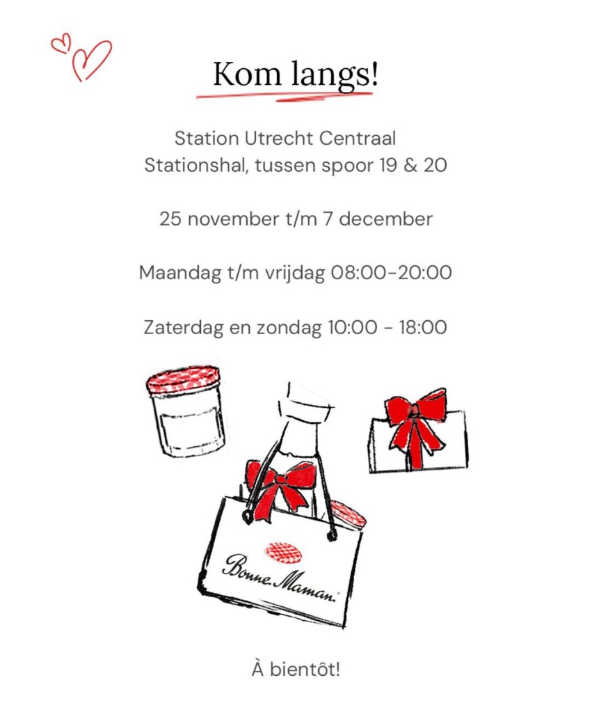 Vanaf dinsdag 25 november tot en met zondag 7 december 2025 opent er een pop-up store van Bonne Maman in de stationshal op het Centraal station van Utrecht. Tussen spoor 19 en 20 kan je heerlijke jams met bijzonder smaken inslaan en zijn er ook leuke accessoires te koop.