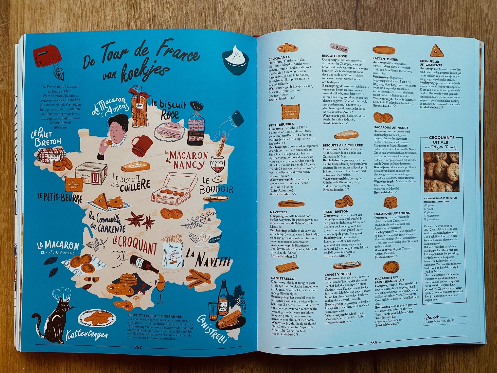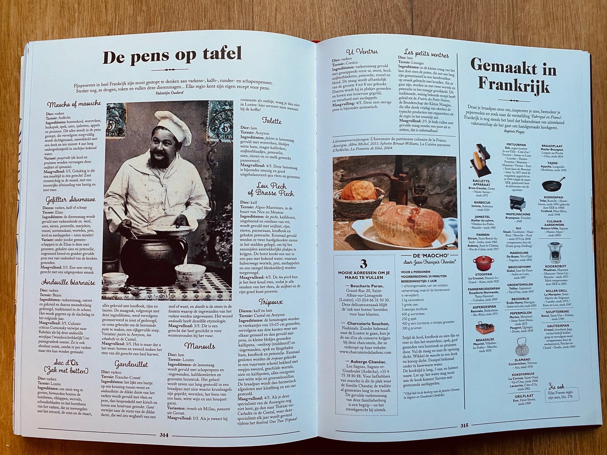 Het boek Proeven van Frankrijk gaat over alles wat met (Frans)eten en drinken te maken heeft. Het is een overweldigend boek, groot van formaat, dik en ook zwaar, maar liefst een dikke 3 kilo. Er is geen inhoudsopgave en elke pagina is weer een verrassing. Het gaat van de hak op de tak, van Franse kippenrassen naar de Hallen in Parijs en van de Michelingids naar een recept over uiensoep. Dat maakt het boek nou juist zo leuk. Je bladert erin, leest een stuk en bladert weer verder. Zo lees je alles over het maken van jam (met allerlei bruikbare tips) om vervolgens op de volgende bladzijde meer te weten te komen over Roquefort kaas.