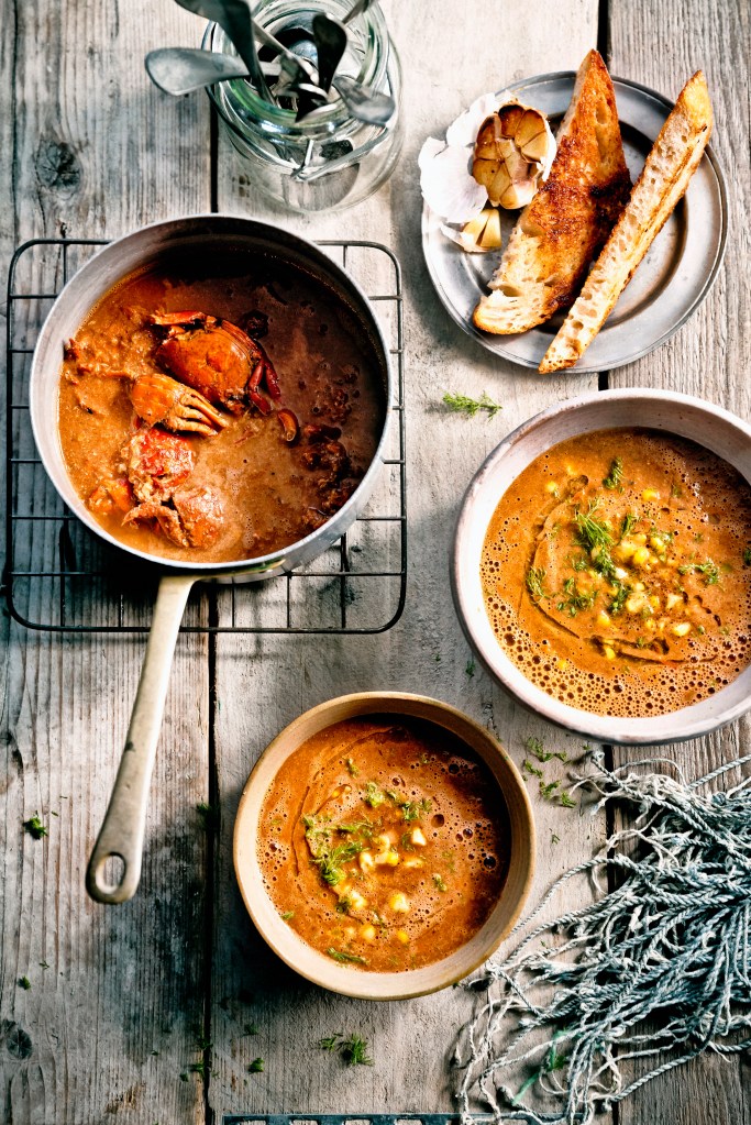 Verwarm de bisque opnieuw en breng op smaak met peper en zout. Verwarm de maïskorrels in wat olijfolie en serveer de bisque met de maïs en wat dille. Geef het brood erbij.