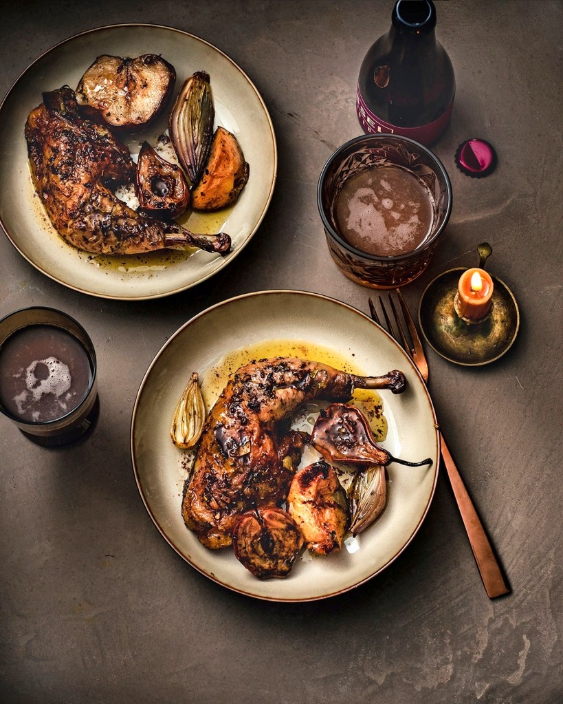 GEROOSTERDE PARELHOEN met appels, peren en appelcider