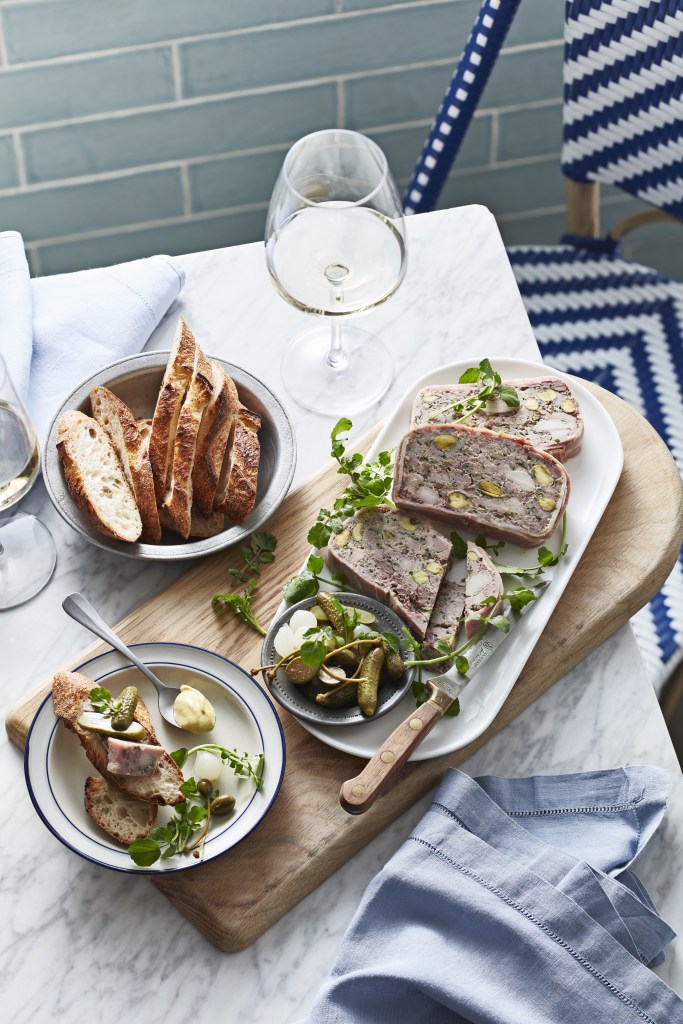 Stort de terrine de volgende dag op een schaal. Veeg het teveel aan gelei eraf. Snijd in plakjes en serveer met augurken, mosterd, zilveruitjes, kapperappeltjes, waterkers en stokbrood.