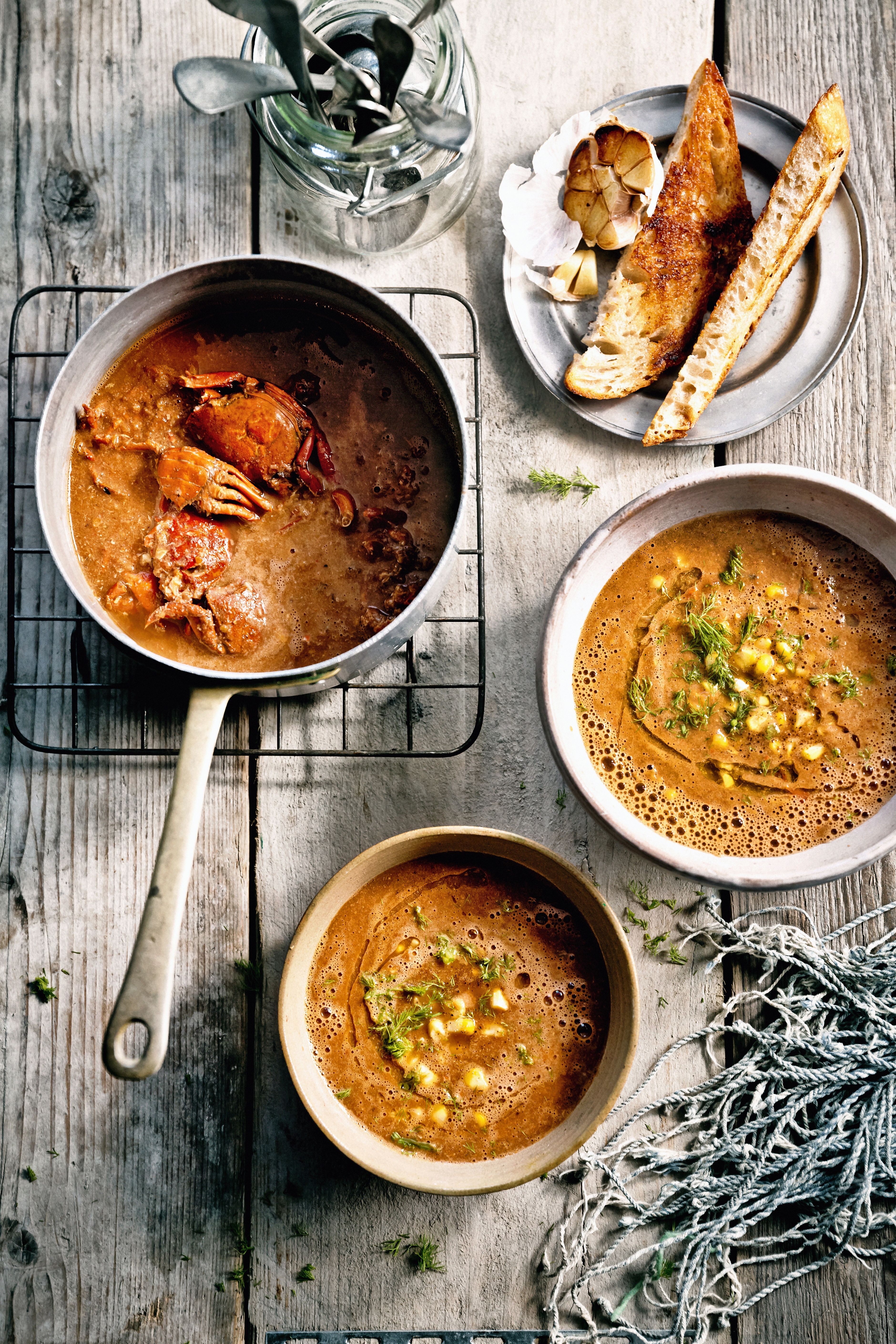 Verwarm de bisque opnieuw en breng op smaak met peper en zout. Verwarm de maïskorrels in wat olijfolie en serveer de bisque met de maïs en wat dille. Geef het brood erbij.