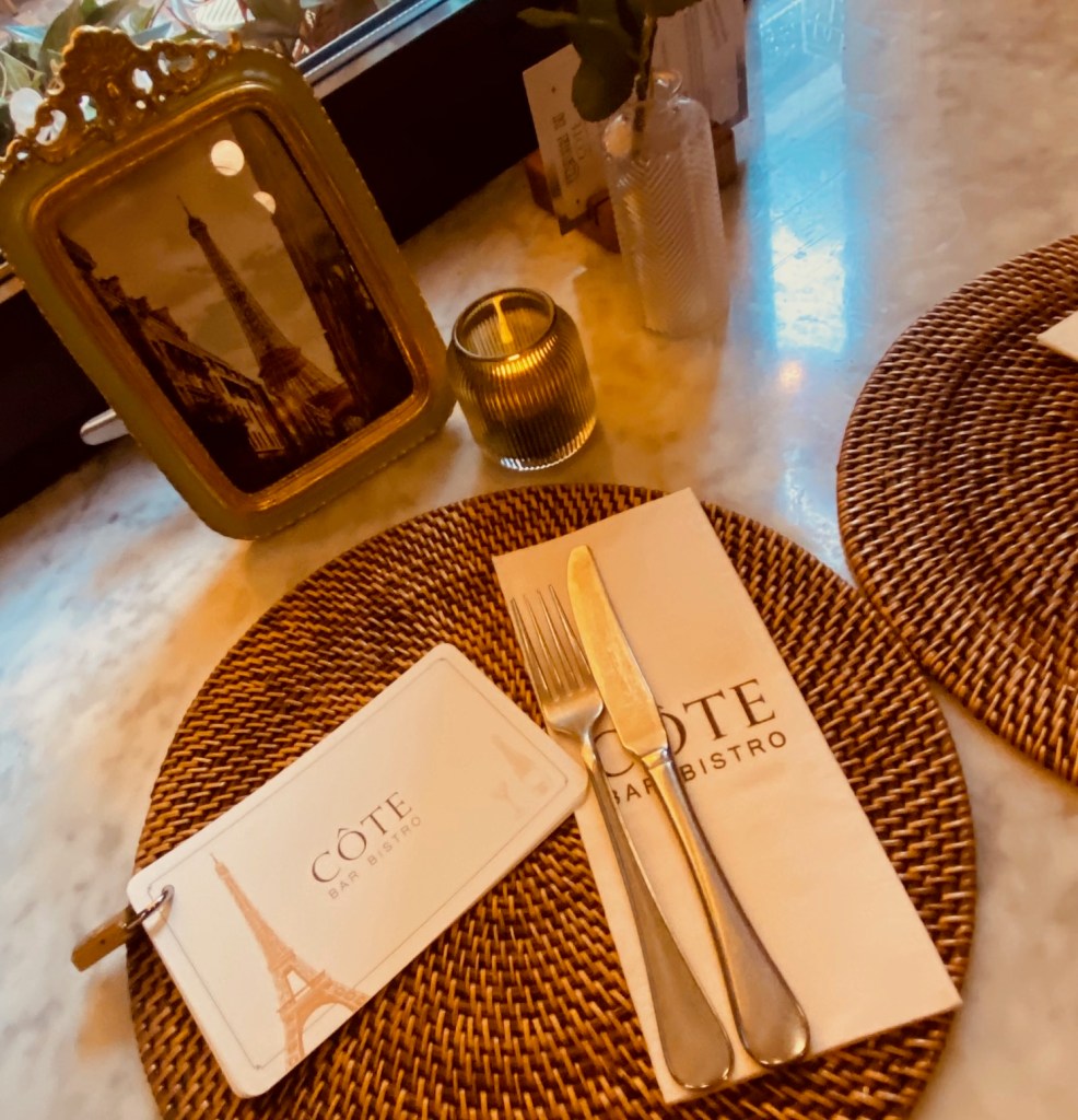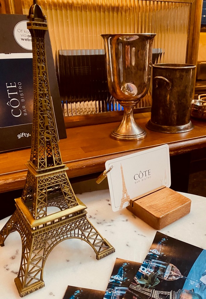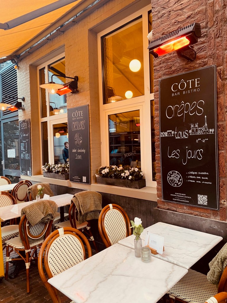 Franse chansons op de achtergrond en een grote Eiffeltoren op een tafeltje bij binnenkomst. Zo kom je binnen bij Côte Bar Bistro in de Korte Putstraat. Buiten is een terras met luifels en heaters maar het regende die middag dus we besloten om lekker binnen te gaan zitten.