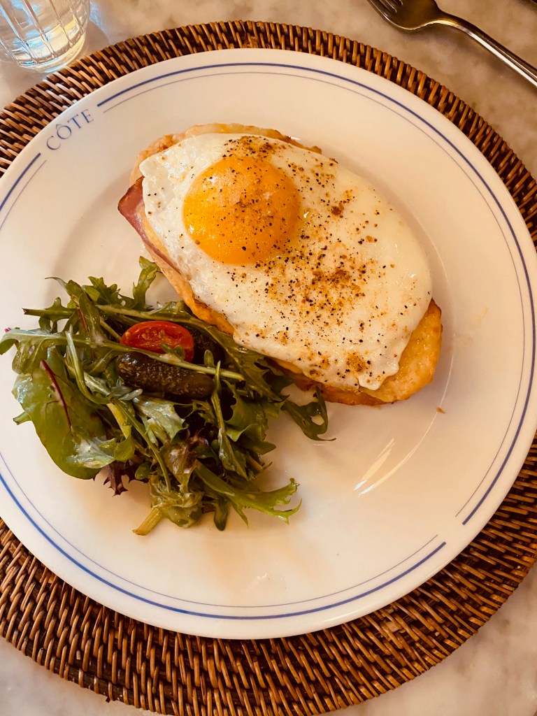 Wij gaan voor de croques oftewel de tosti’s. Deze worden al vrij snel gereserveerd. Heerlijk dikke plakken zuurdesembrood met daarop bechamelsaus, goede beenham en een beetje Dijon mosterd. En dat alles even onder de grill geweest. Vers klaargemaakt en zeer goed van smaak.