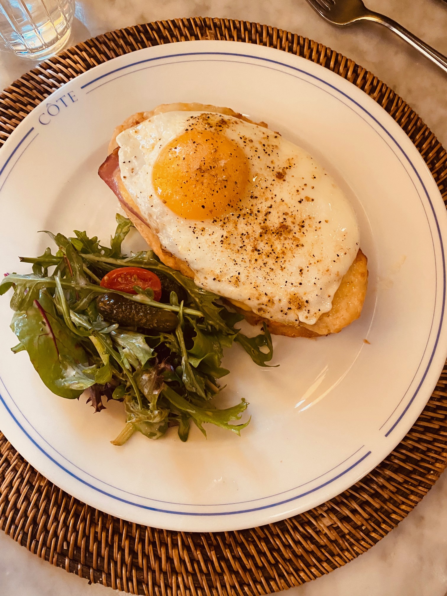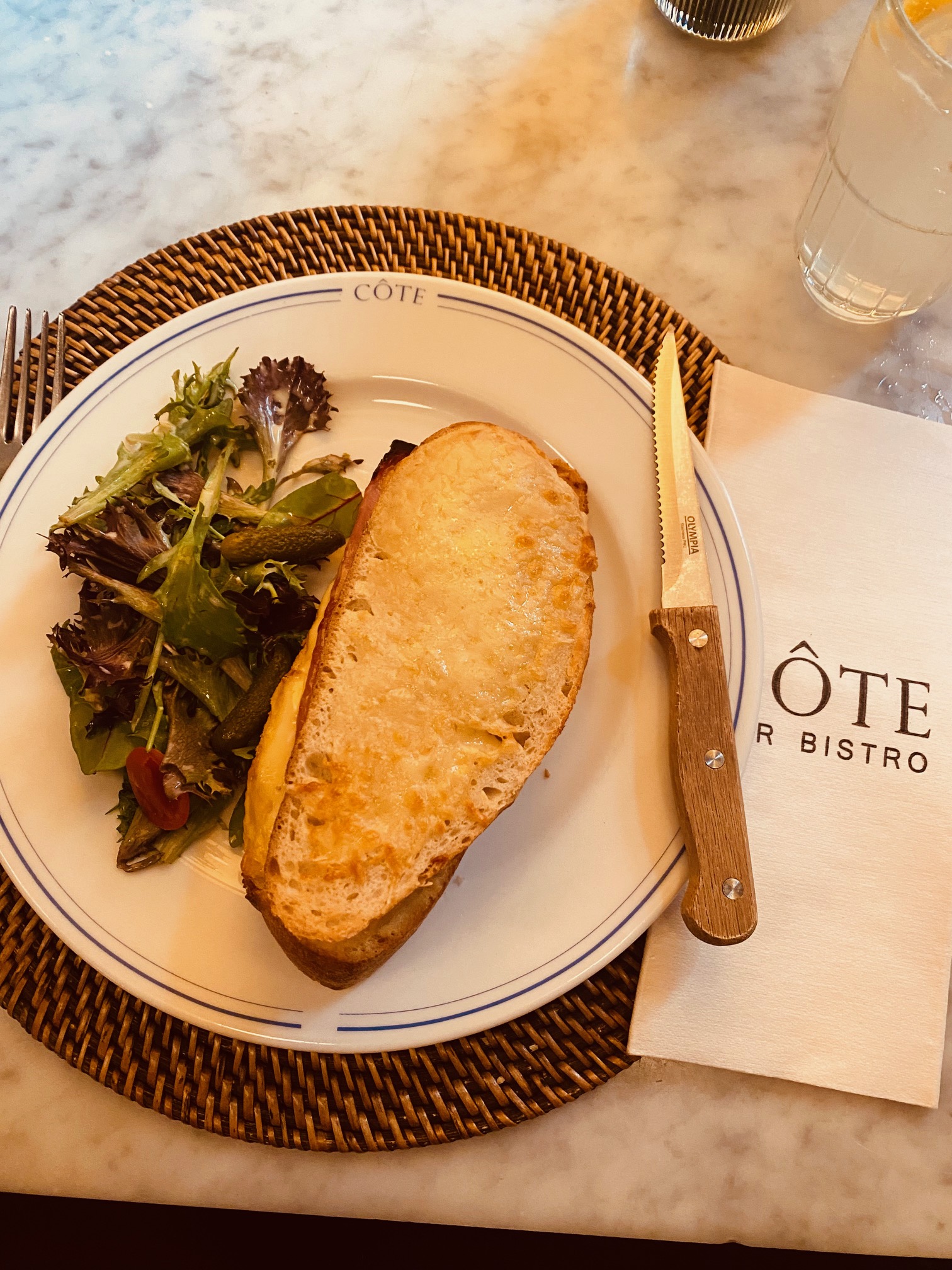 Wij gaan voor de croques oftewel de tosti’s. Deze worden al vrij snel gereserveerd. Heerlijk dikke plakken zuurdesembrood met daarop bechamelsaus, goede beenham en een beetje Dijon mosterd. En dat alles even onder de grill geweest. Vers klaargemaakt en zeer goed van smaak.