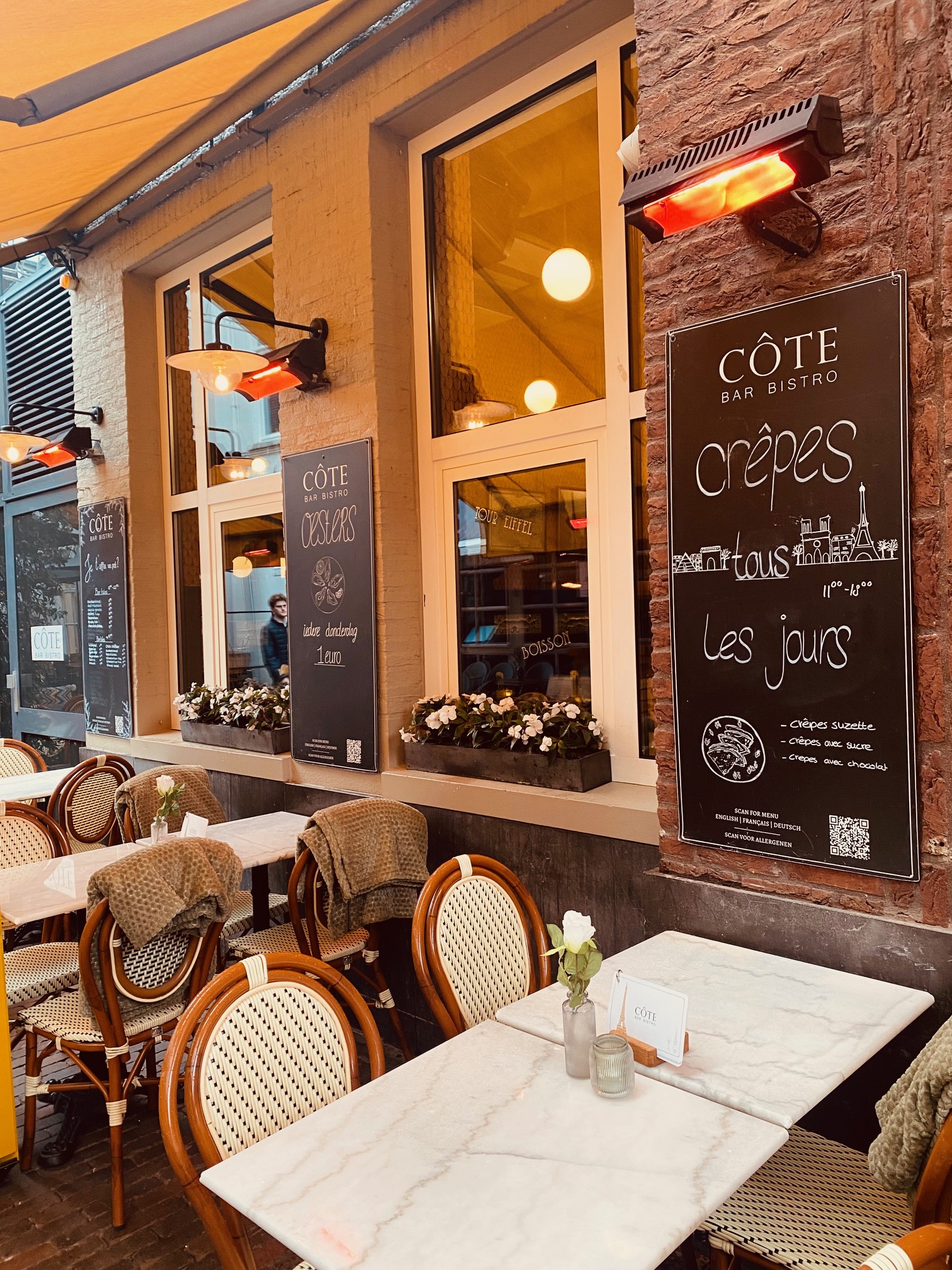 Franse chansons op de achtergrond en een grote Eiffeltoren op een tafeltje bij binnenkomst. Zo kom je binnen bij Côte Bar Bistro in de Korte Putstraat. Buiten is een terras met luifels en heaters maar het regende die middag dus we besloten om lekker binnen te gaan zitten.