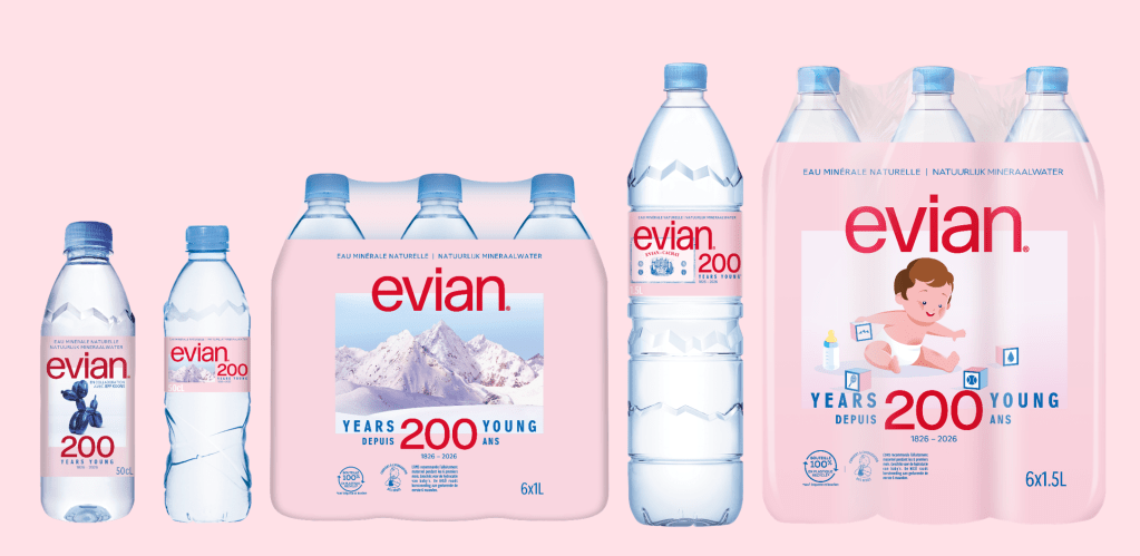 De gewone plastic waterflessen van Evian krijgen dit jaar ook een eigen etiket. Zo is er een etiket met daarop de Balloon Dog van Jef Koons, gaat er een etiket terug in de tijd en zijn de 3 punten van de bergtoppen te zien op een etiket. Deze verwijzen uiteraard naar de 3 bergtoppen in het logo van Evian.