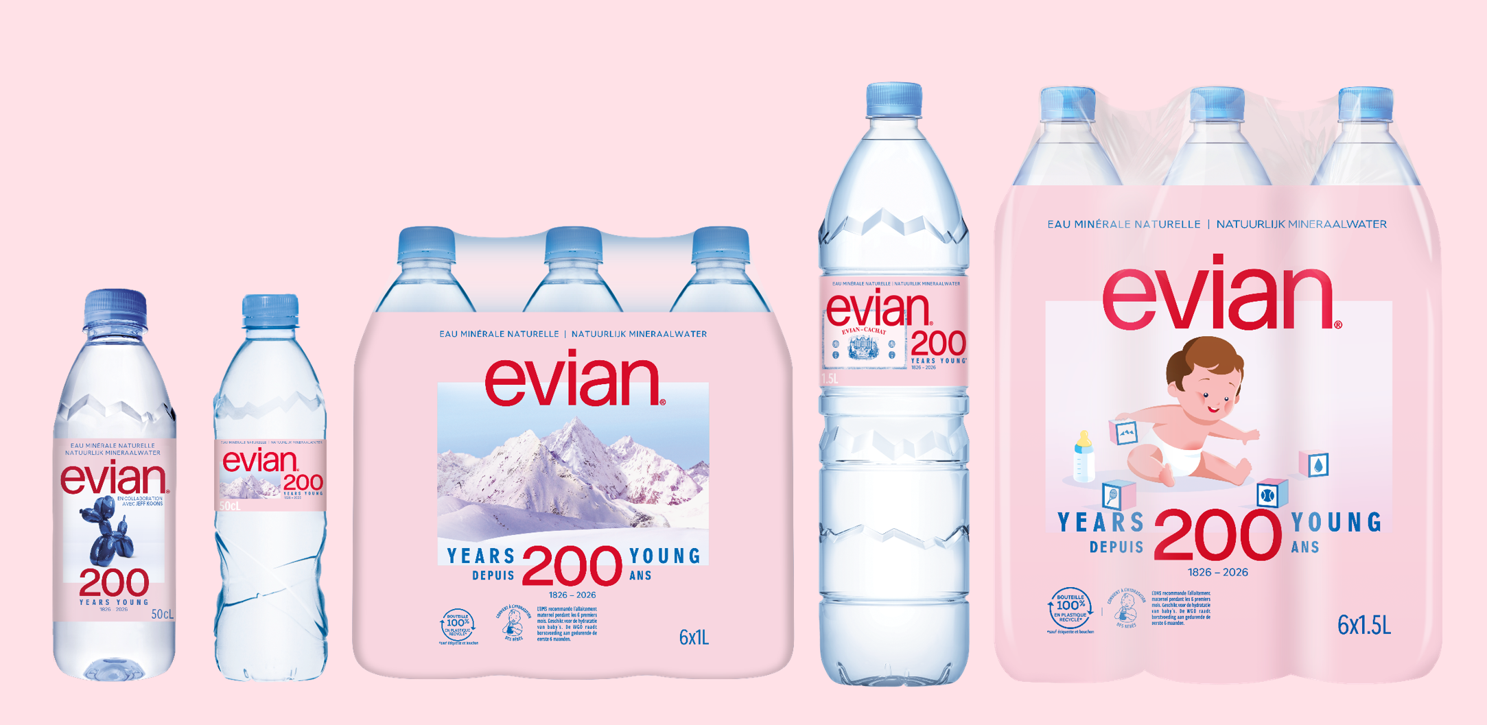 De gewone plastic waterflessen van Evian krijgen dit jaar ook een eigen etiket. Zo is er een etiket met daarop de Balloon Dog van Jef Koons, gaat er een etiket terug in de tijd en zijn de 3 punten van de bergtoppen te zien op een etiket. Deze verwijzen uiteraard naar de 3 bergtoppen in het logo van Evian.