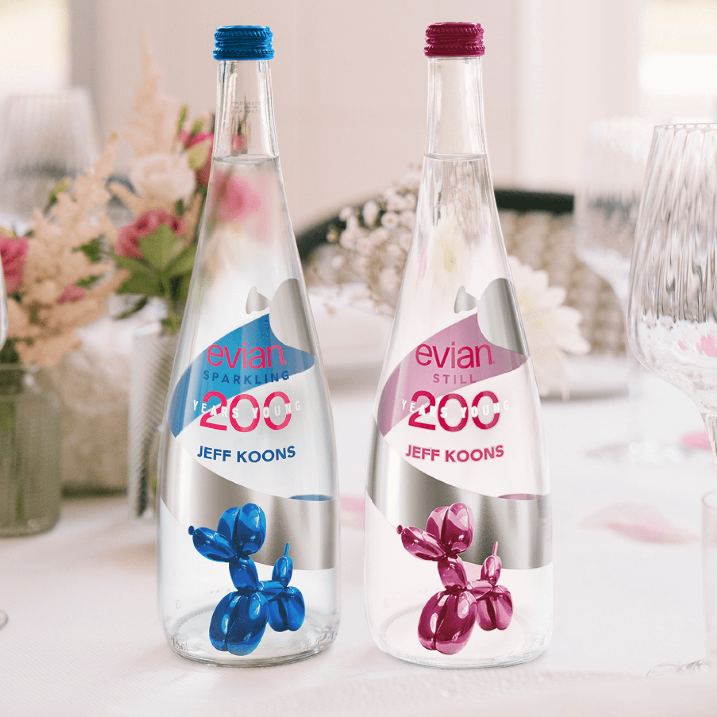 Sinds 2007 laat Evian elk jaar een waterfles ontwerpen door een bekende kunstenaar of ontwerper. Zo hebben Christian Lacroix, Jean Paul Gaultier en Kenzo al een ontwerp mogen maken. Om de mooie mijlpaal te vieren van 200 jaar is de kunstenaar Jeff Koons aangetrokken om maar liefst 2 water flessen te ontwikkelen. Namelijk een roze fles voor still water en blauw voor sparkling water. Het speelse ontwerp op de fles geeft een feestelijke uitstraling aan de eettafel, zowel thuis als in de gastronomie. Op de fles is namelijk de iconische ‘Balloon Dog’ te zien in zowel roze als blauw. Inderdaad een mooie eye-catcher voor op tafel.