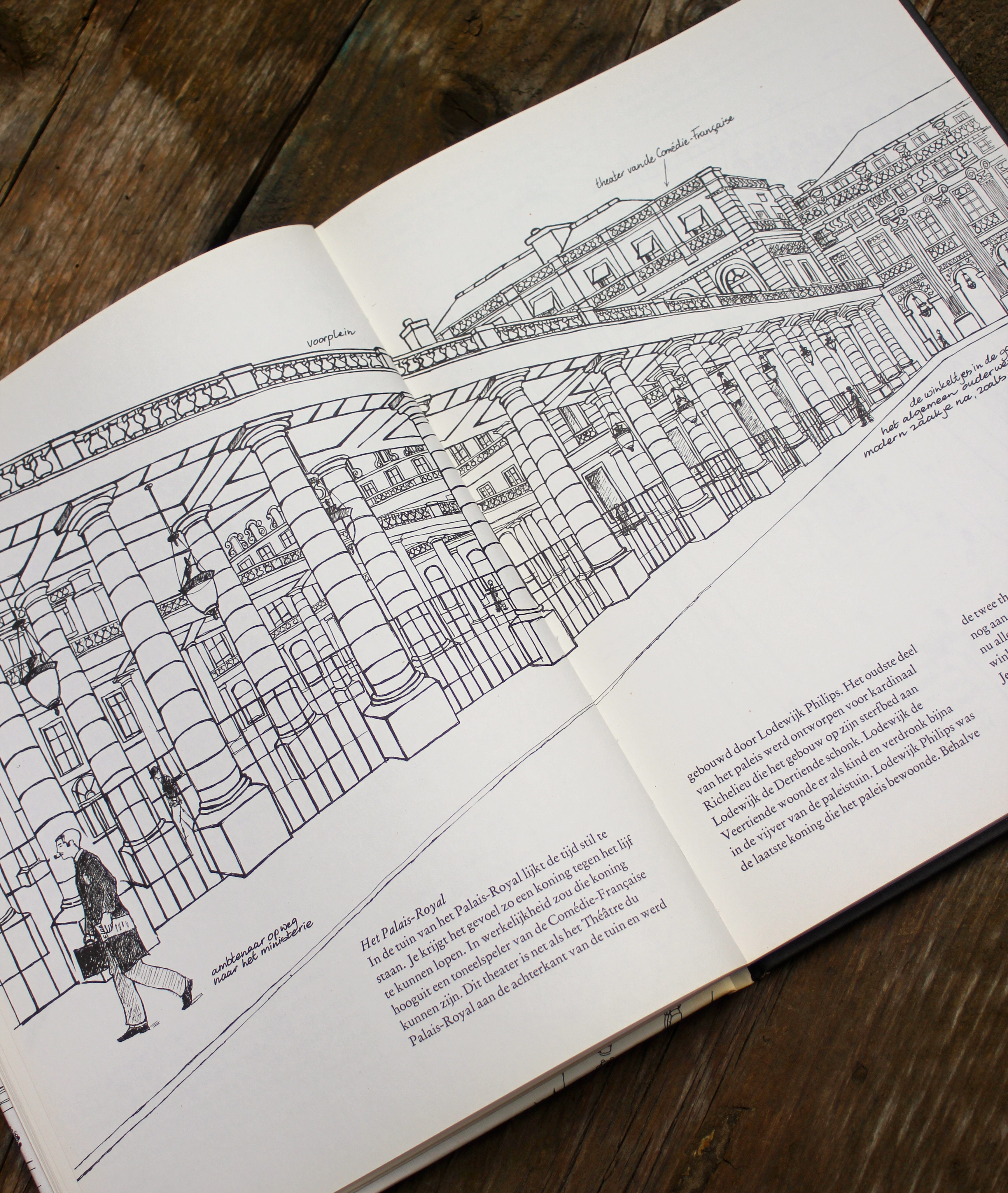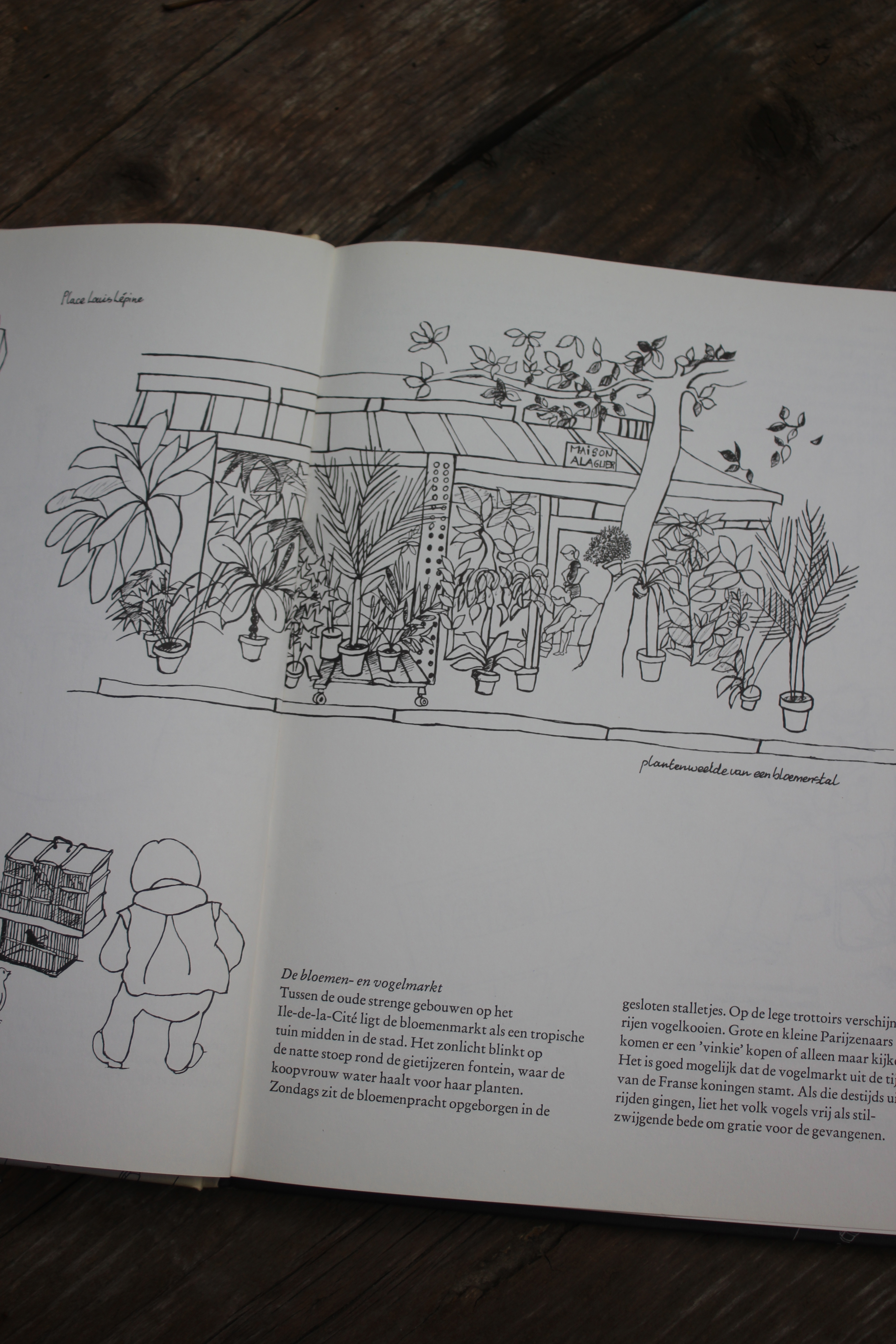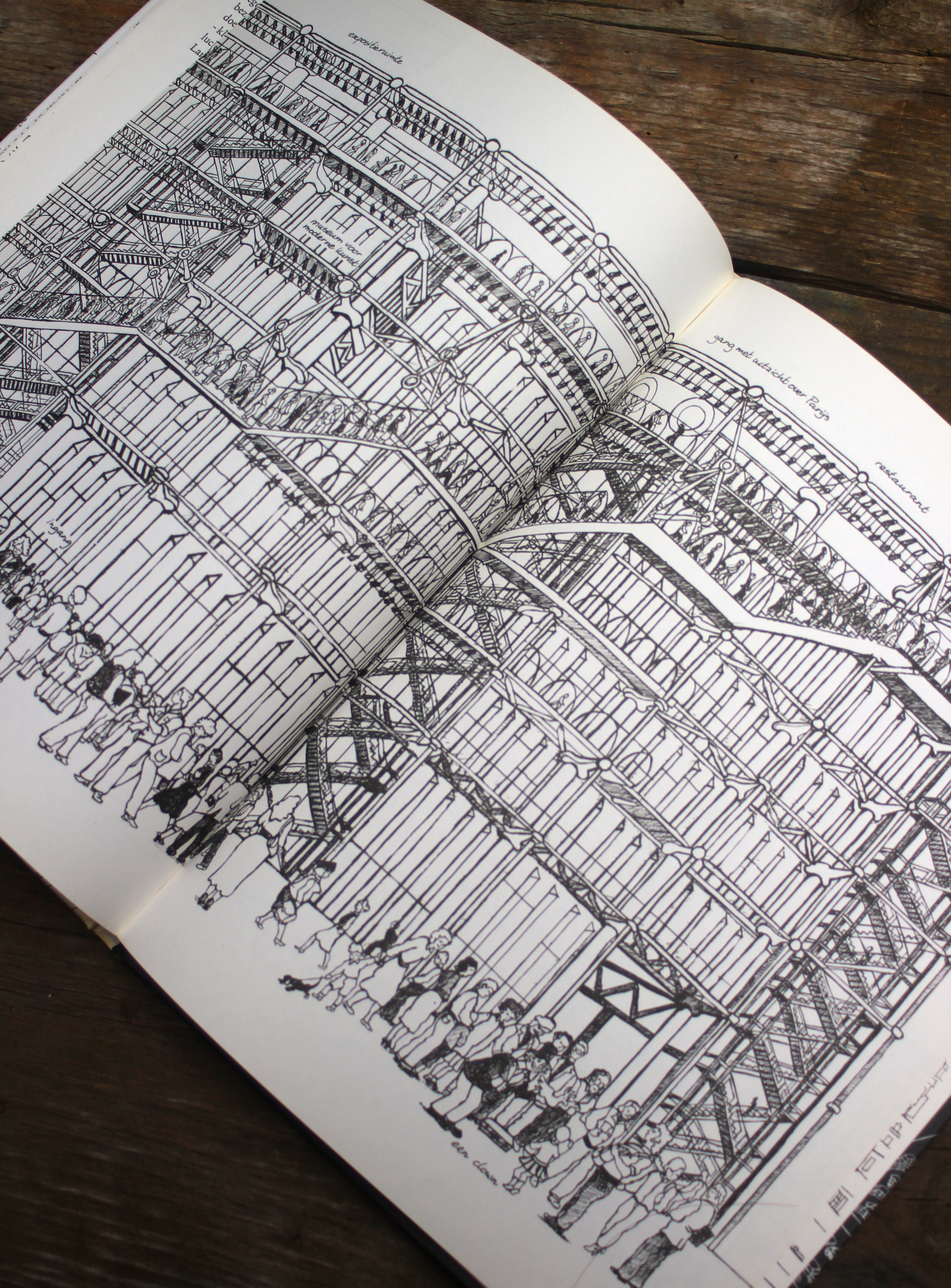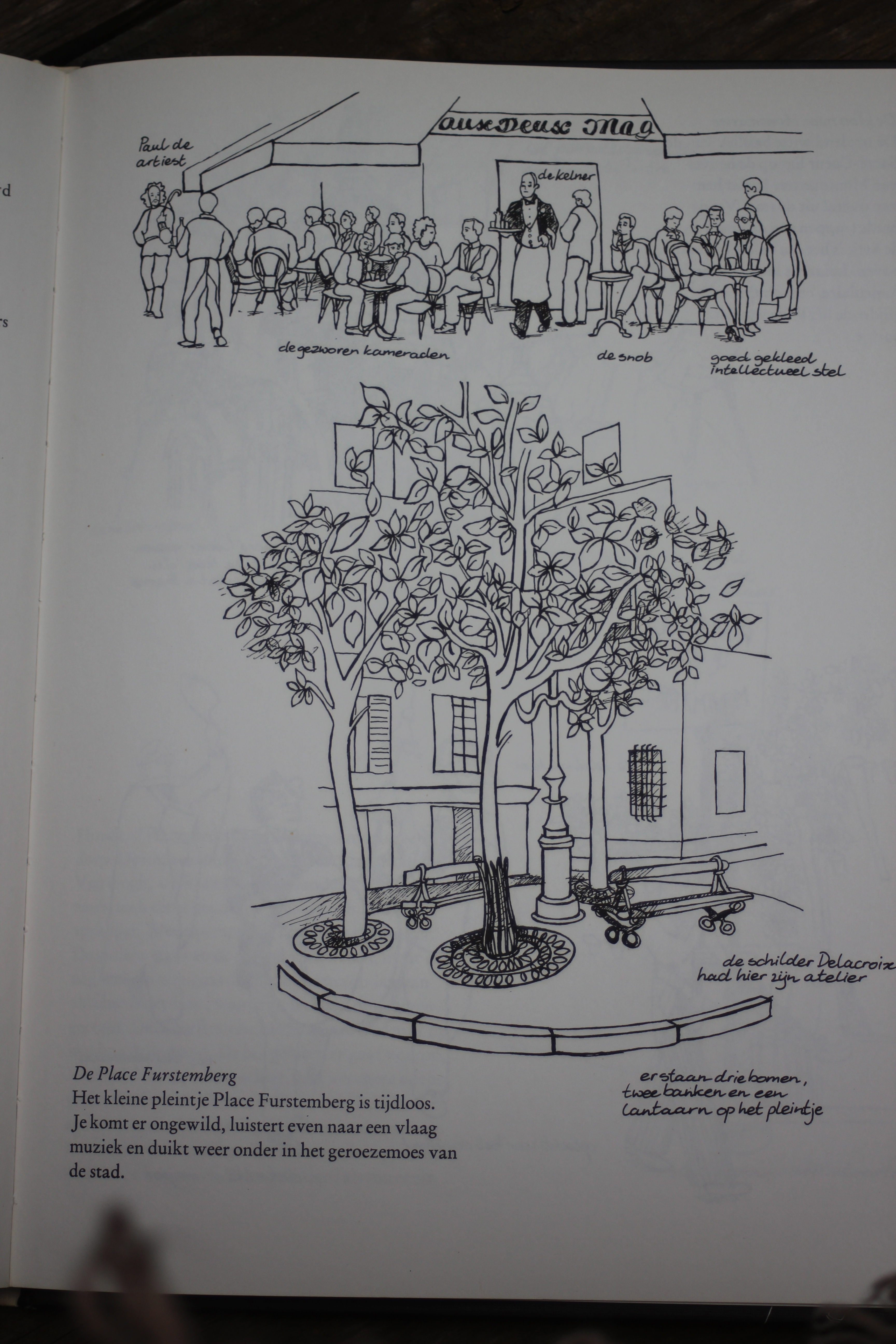 Het boek over Parijs stamt uit 1980 dus al zo’n 34 jaar oud. Het boek bevat alleen maar zwart-wit tekeningen met daarbij een korte toelichting over de gebouwen en andere bezienswaardigheden in de stad. De plekken in de stad zijn nog steeds dezelfde alleen sommige omschrijvingen kloppen niet helemaal meer. De tijd heeft zijn werk gedaan in positieve of in negatieve zin. Sommige plekken zijn opgeleefd en zijn nu helemaal hip, andere, die toen in de jaren ’80 hot waren, zijn nu wat “vergaan”. Maar de meeste dingen blijven overeind staan in deze stad, een stad die eigenlijk een museum op zich is maar die betekenis krijgt door de mensen die er wonen en werken.