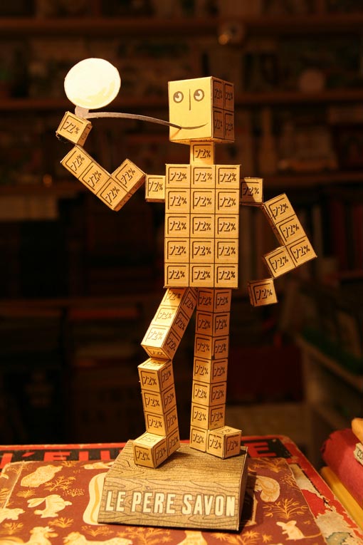 Het is een bouwplaat voor een poppetje met pijp van allemaal “kubussen” van Le Père Savon zeep. Waarschijnlijk een leuke bezigheid in de tijd dat het gemaakt is, nu zouden we er een spelletje met kubussen van maken voor op de Ipad. Maar mocht er een keer een druilige zondagmiddag voorbij komen dan….